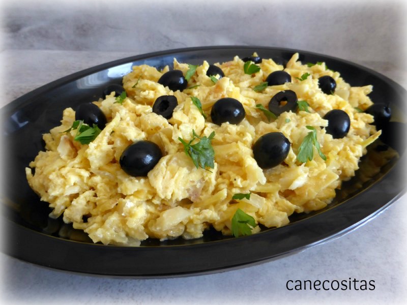 Lo importante de este plato es el cuajado de los huevos, si nos pasamos de tiempo, quedara un bacalao más seco, es mejor estar pendientes, ya que aun separándo del fuego la sarten, el huevo sigue un poco con el calor residual. mejor que nos quede jugosito.