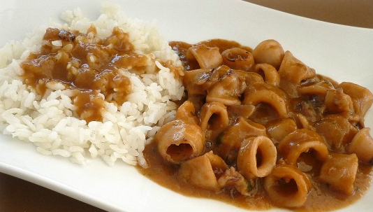CALAMARES ENCEBOLLADOS CON ARROZ BLANCO