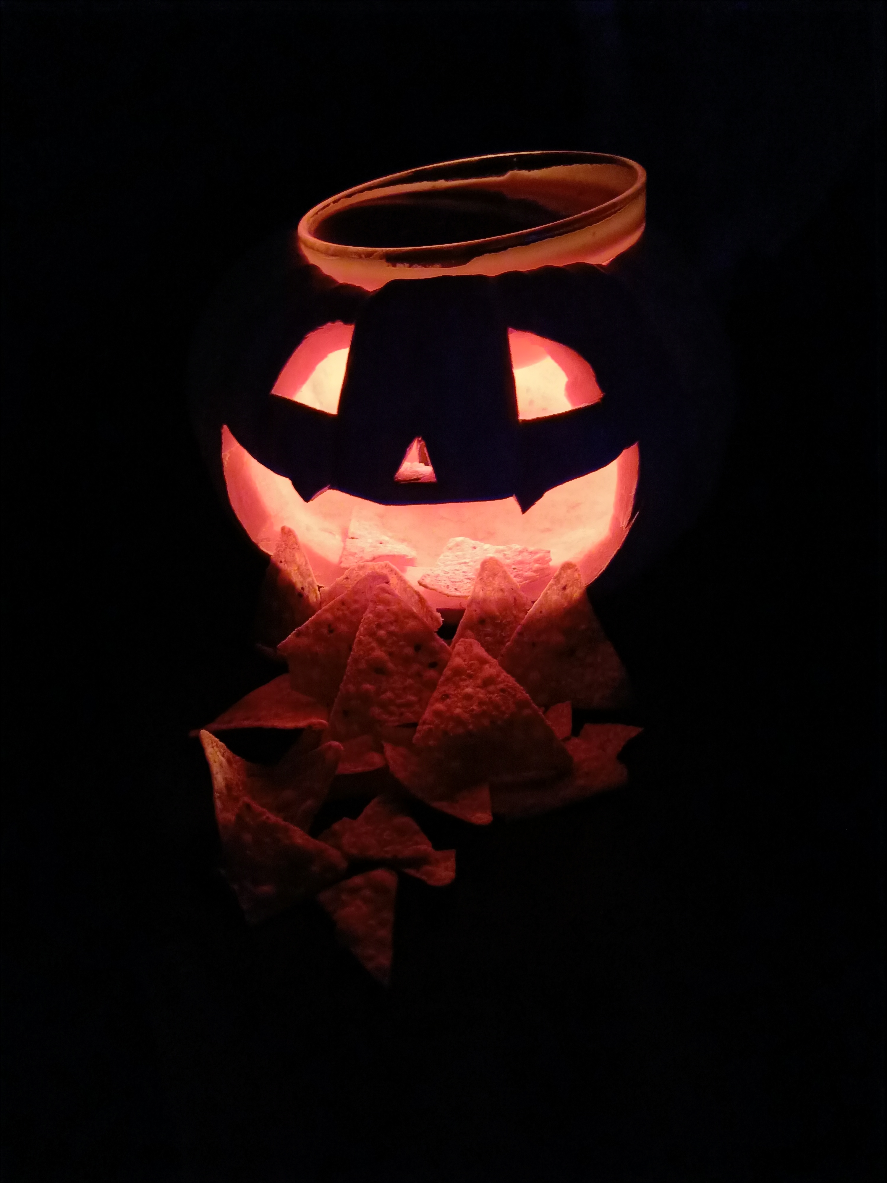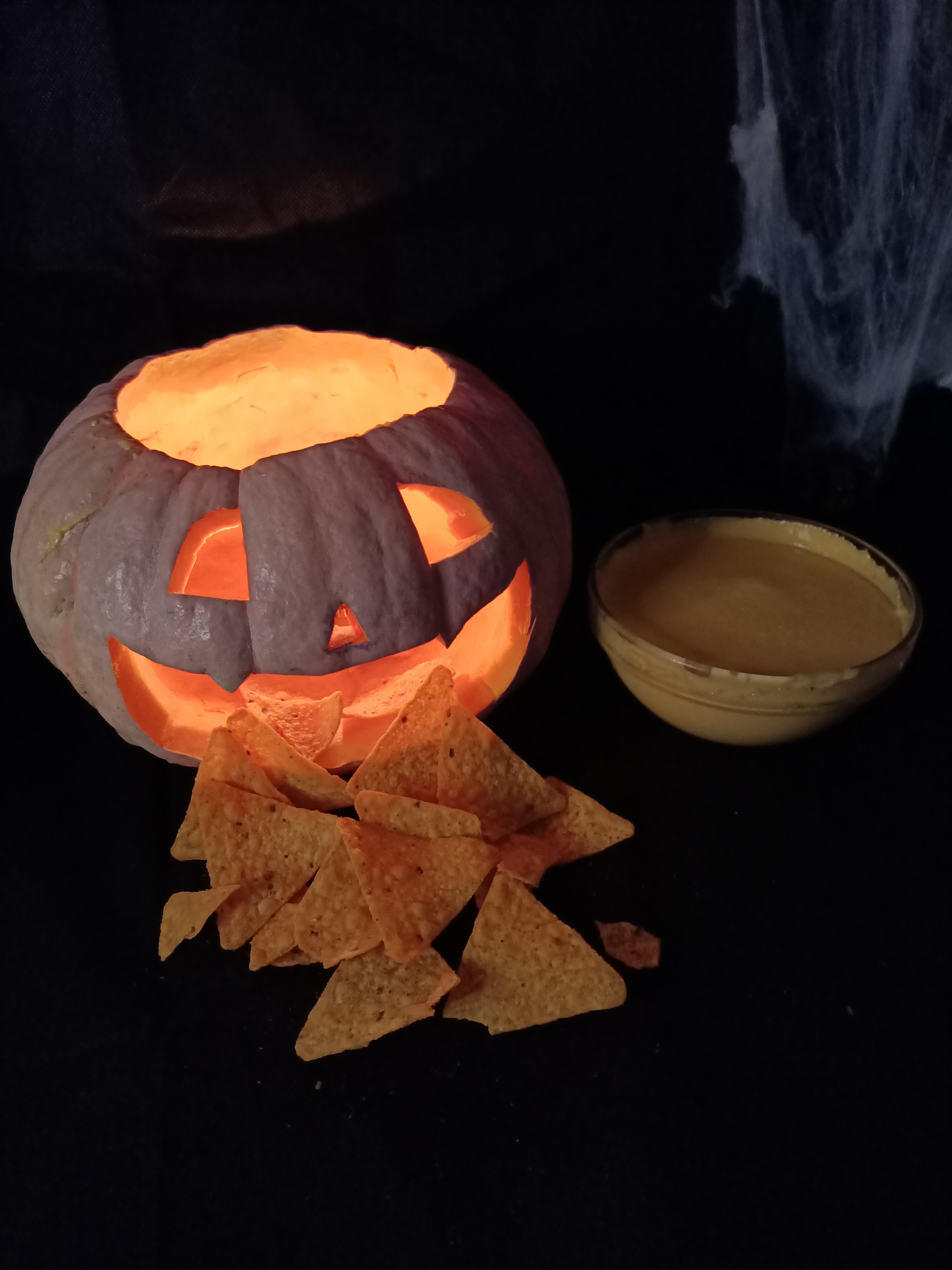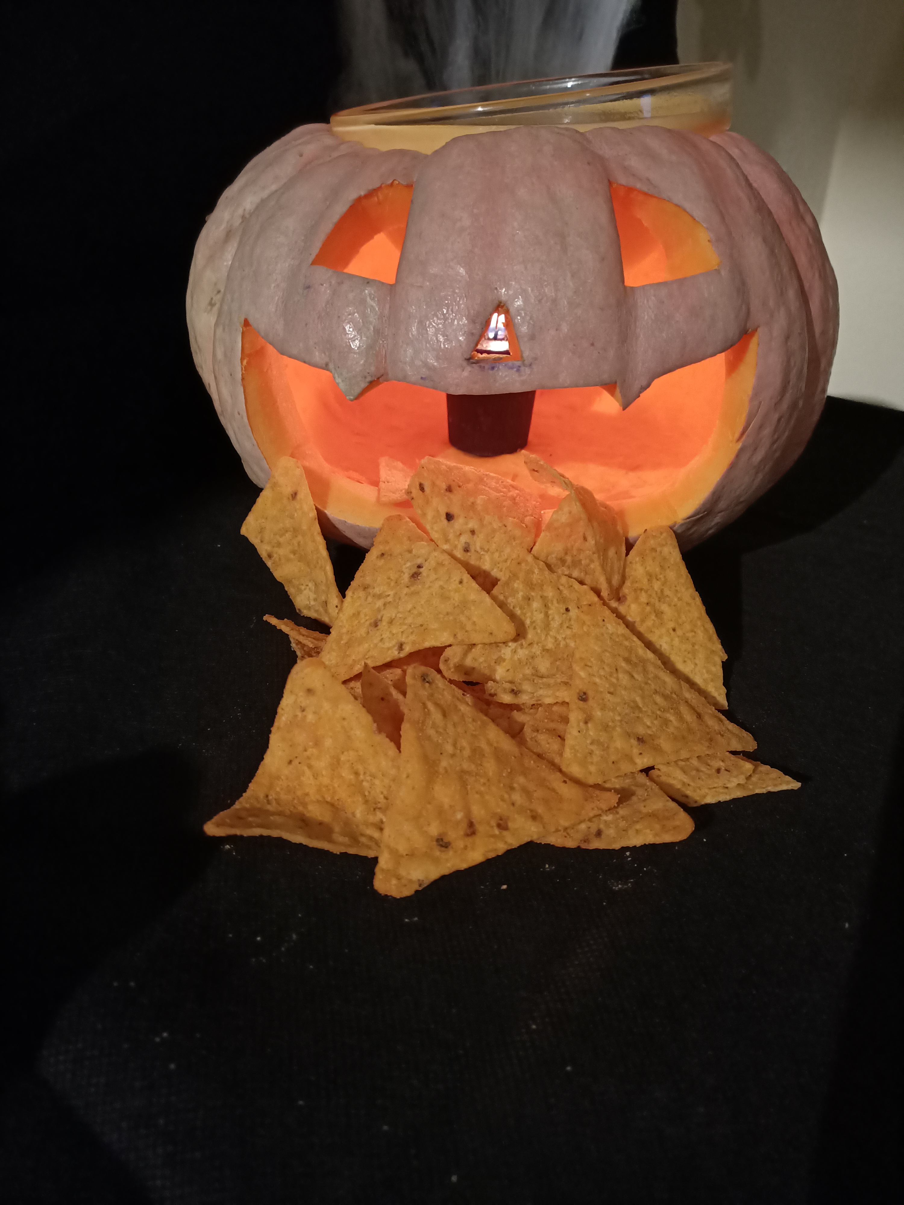 Ya nos queda solamente poner el recipiente dentro de la calabaza, y poner en la boca los nachos.