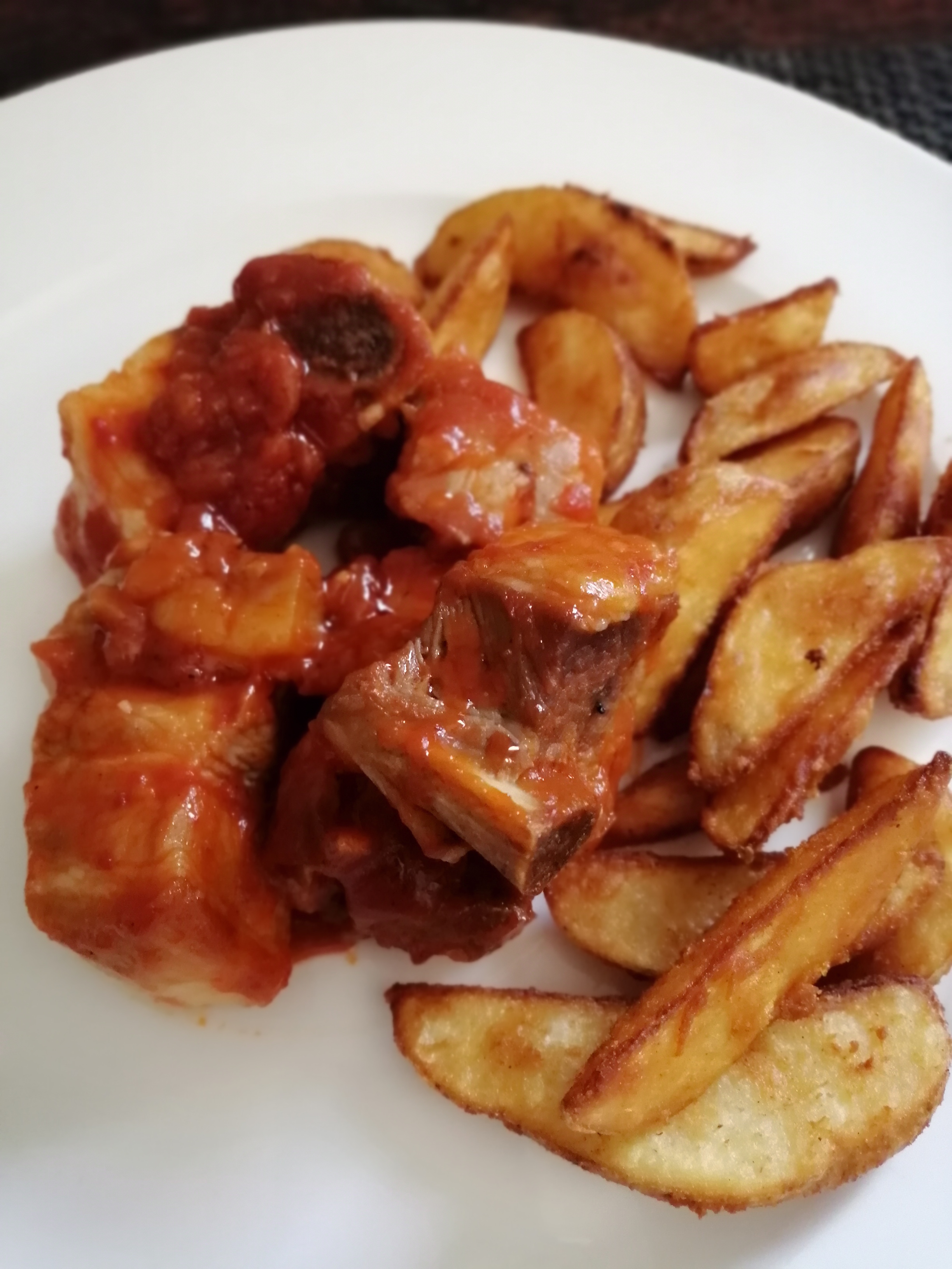 Ponga en el vaso las costillas, el aceite, la salsa barbacoa, el agua y la maicena. Programe 30 min/Varoma/giro inversa/vel cuchara. Sirva las costillas con patatas chips.