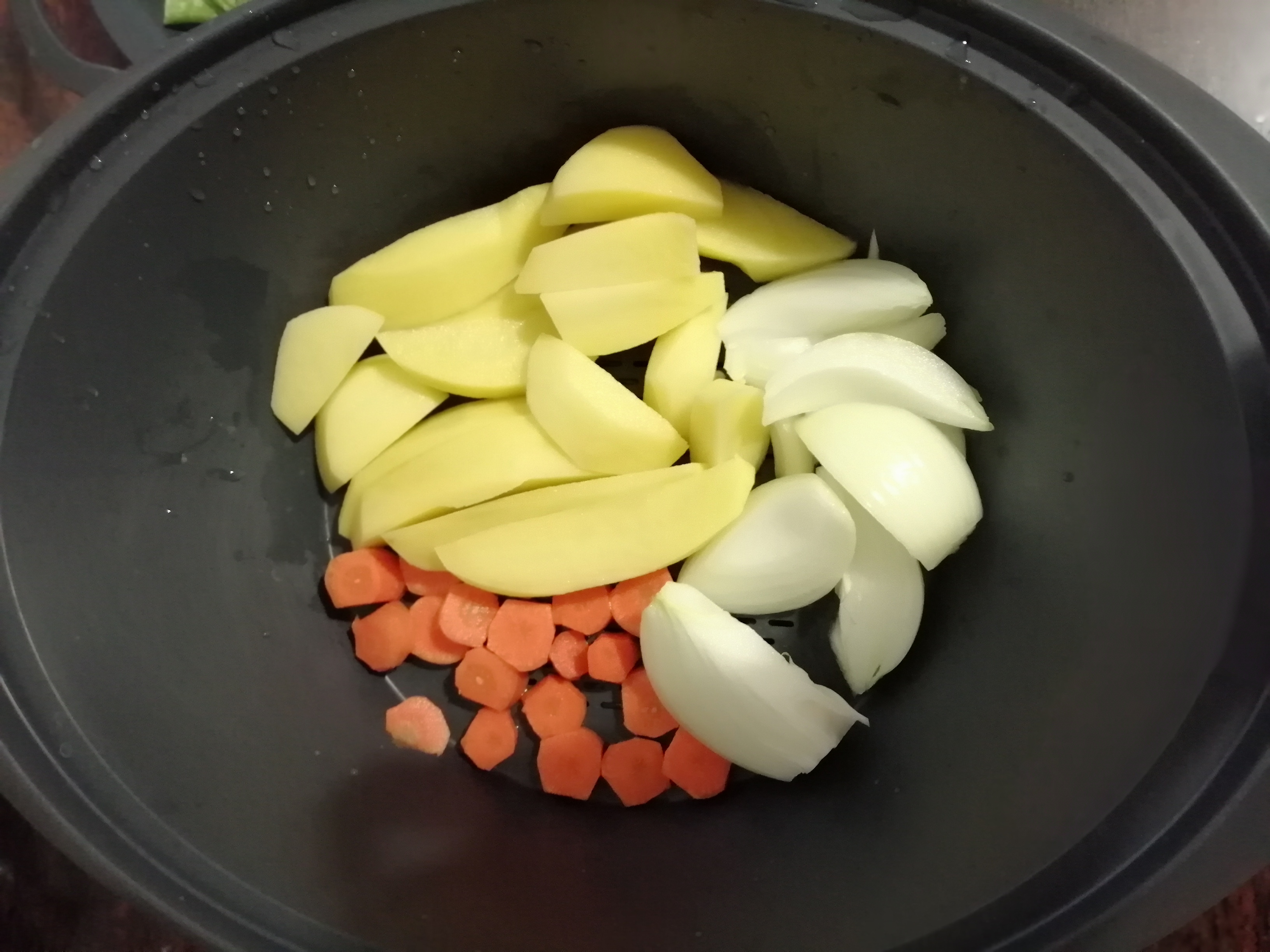 Recordar que se tiene que poner el alimento más duro (cebolla, zanahoria etc) más cerca de la fuente del calor. He puesto en el varoma estas verduras.