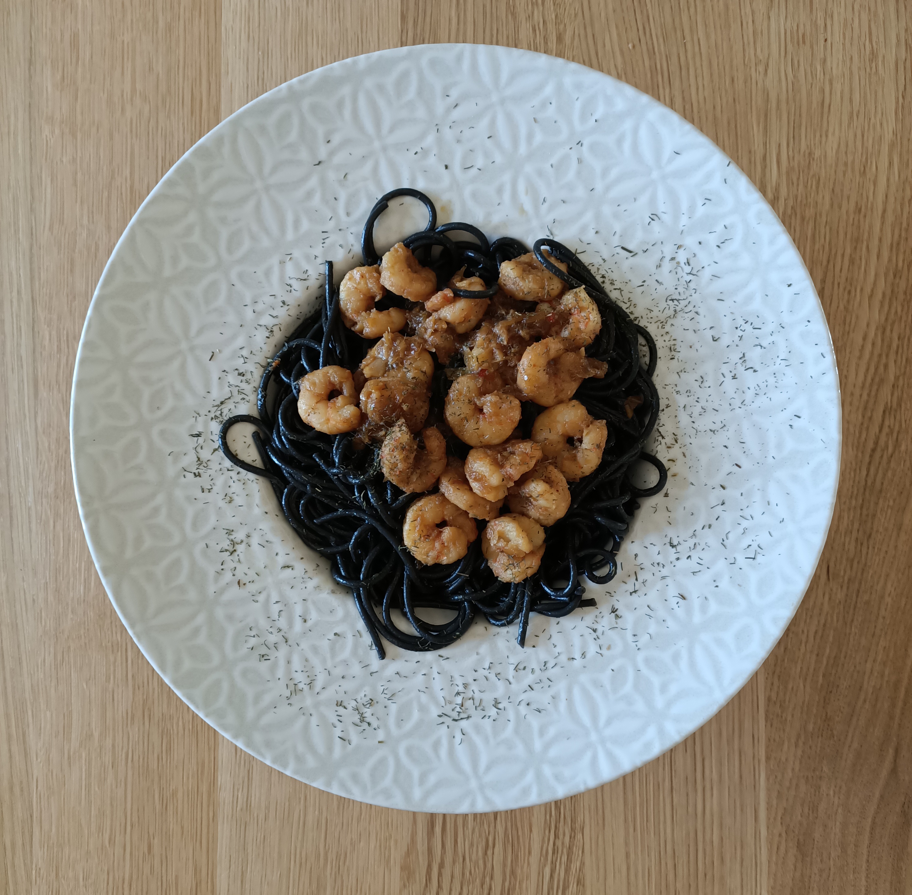 Espaguetis negro con gambas agridulce