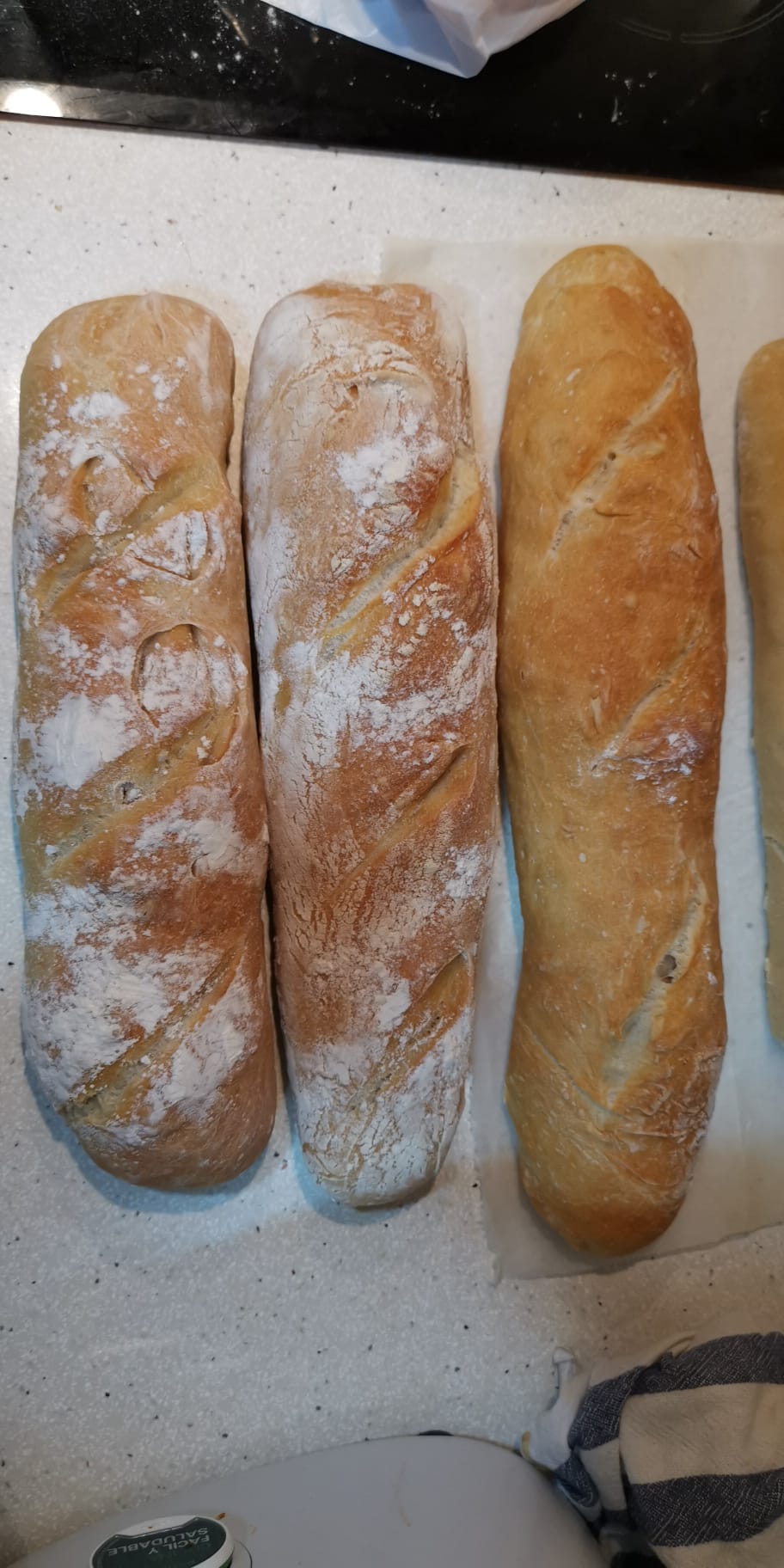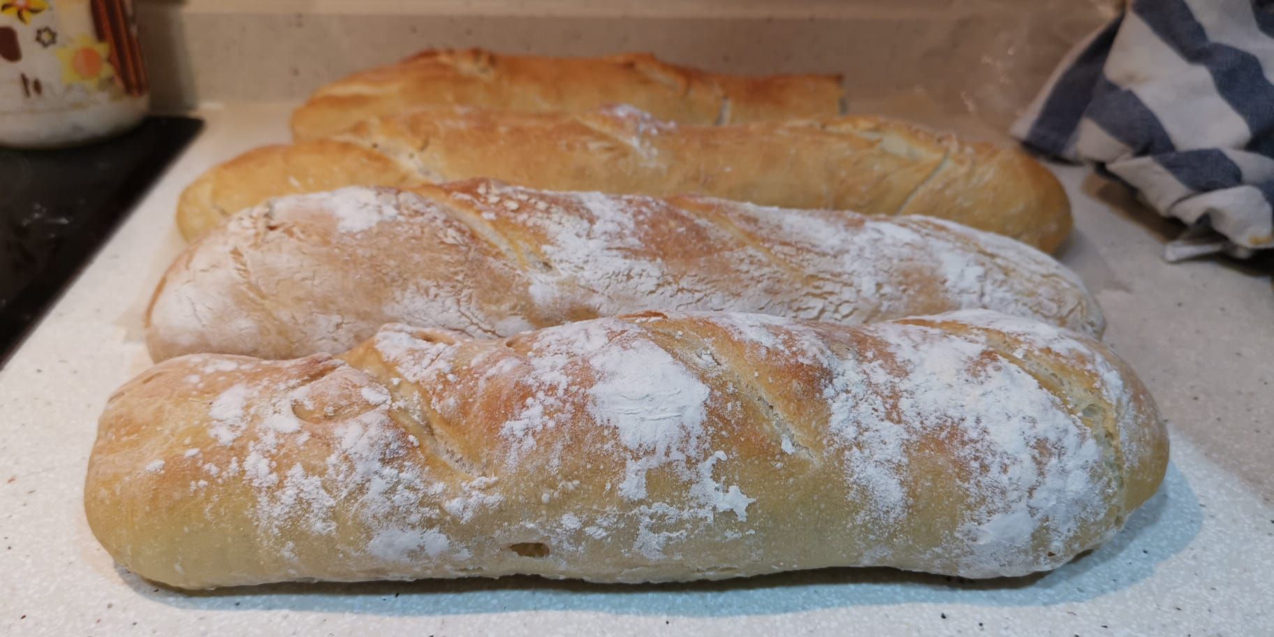 Prepare aprox. 100 g de agua muy caliente en una taza. Con un cuchillo muy afilado, haga 3 cortes diagonales en la superficie de cada baguette. Deslice las baguettes, junto con el papel de hornear, sobre la bandeja precalentada situada más arriba. Rápidamente pero con cuidado, vierta el agua caliente sobre la bandeja que está debajo para crear vapor y cierre inmediatamente la puerta del horno para atraparlo. Hornee durante 20 minutos (250°C), o hasta que hayan tomado color dorado oscuro .Si las baguettes estuvieran ya bastante oscuras antes de terminar el tiempo de horneado, reduzca la temperatura del horno a 230°C. Deje enfriar las baguettes durante 20 minutos antes de cortarlas en rebanadas.