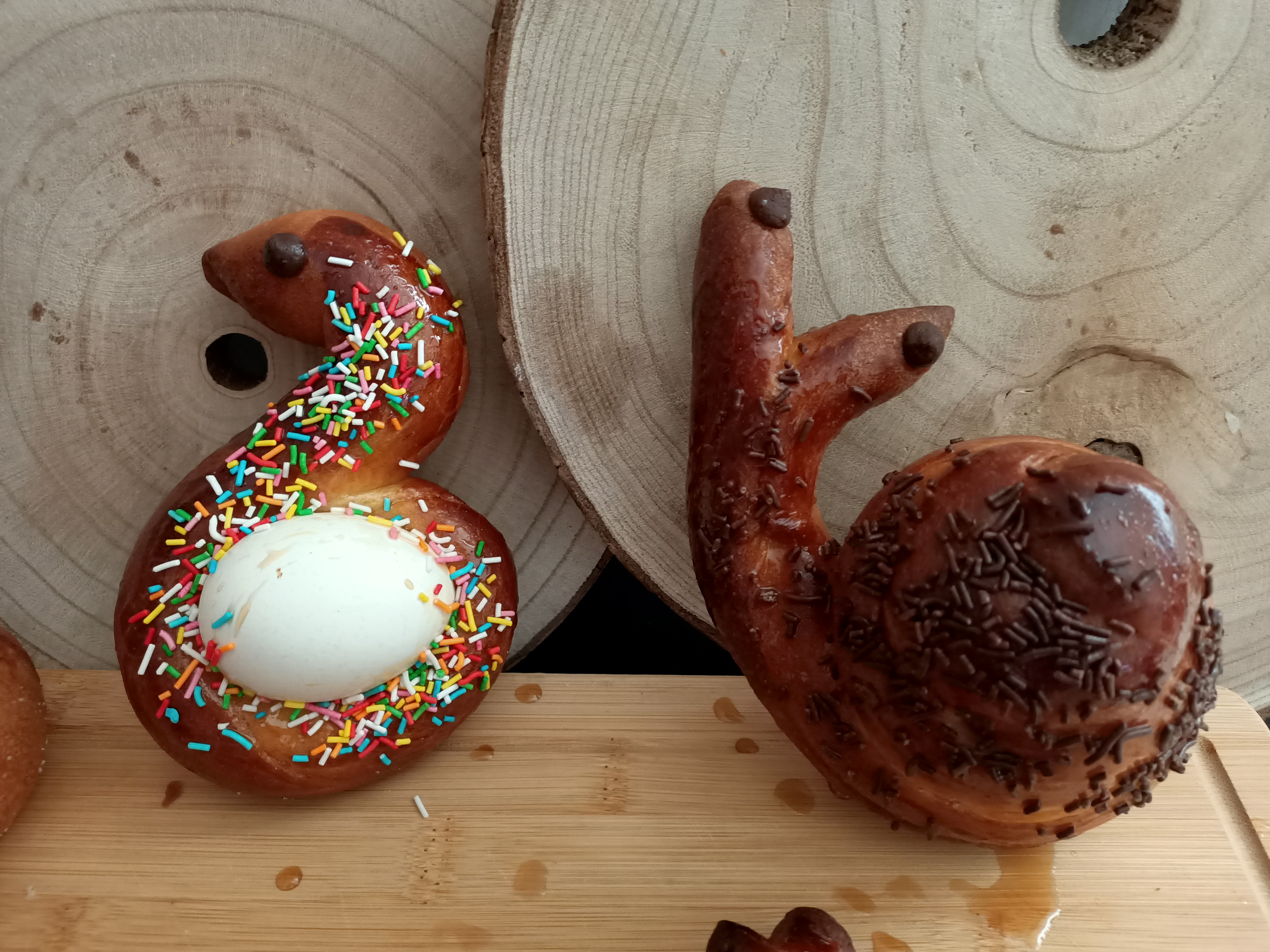 Colóquelas en la bandeja de horno preparada. Ponga encima de cada una 1 huevo duro teñido, píntelas con huevo batido y espolvoree con azúcar.
