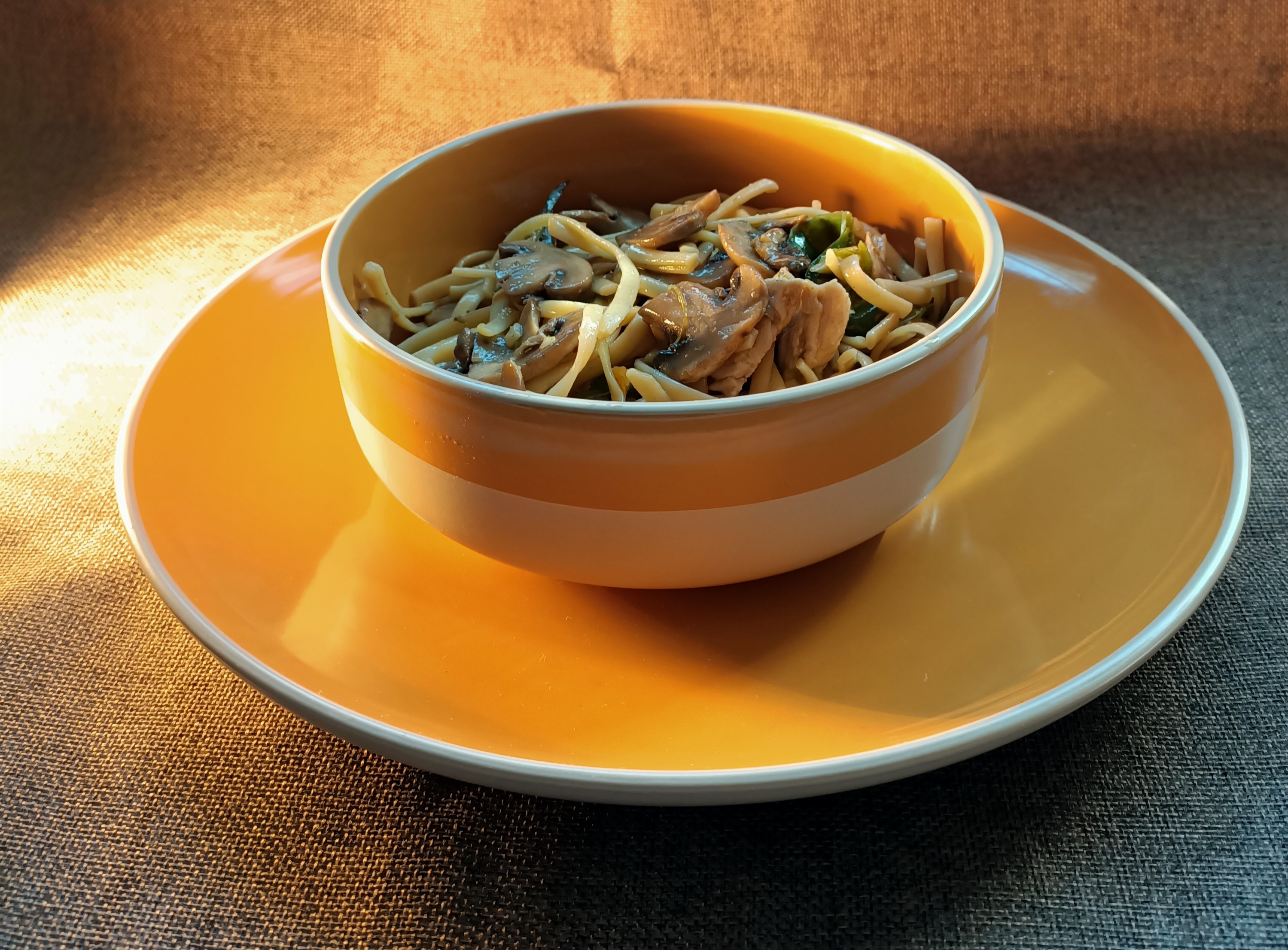 7. Agregue al vaso el pimiento, los champiñones, el calabacín, el jengibre, la salsa de soja y la salsa de pescado el aceite de sésamo, sin poner el cubilete rehogue 10 min/120°C/giro inverso /vel cuchara.