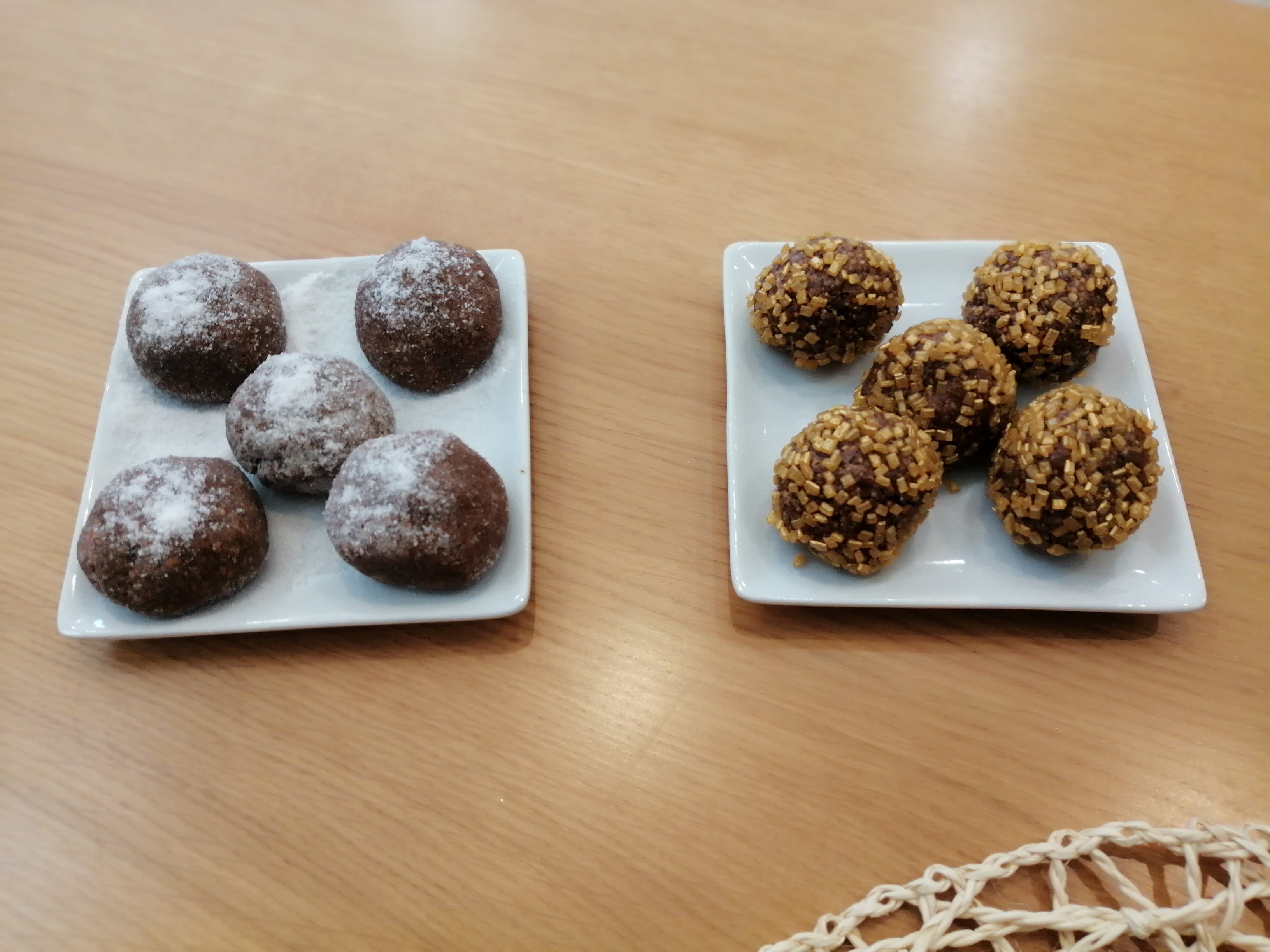 Ponga en el vaso las almendras y las avellanas tostadas, el chocolate y 50 g del azúcar glas reservado. Inicie Triturar /30 seg. Con dos cucharitas vaya poniendo porciones de la mezcla en una bandeja forrada con papel de hornear (aprox. 24). Reserve en el frigorífico durante 20 minutos. Rebócelas en el azúcar glas reservado y sirva inmediatamente.