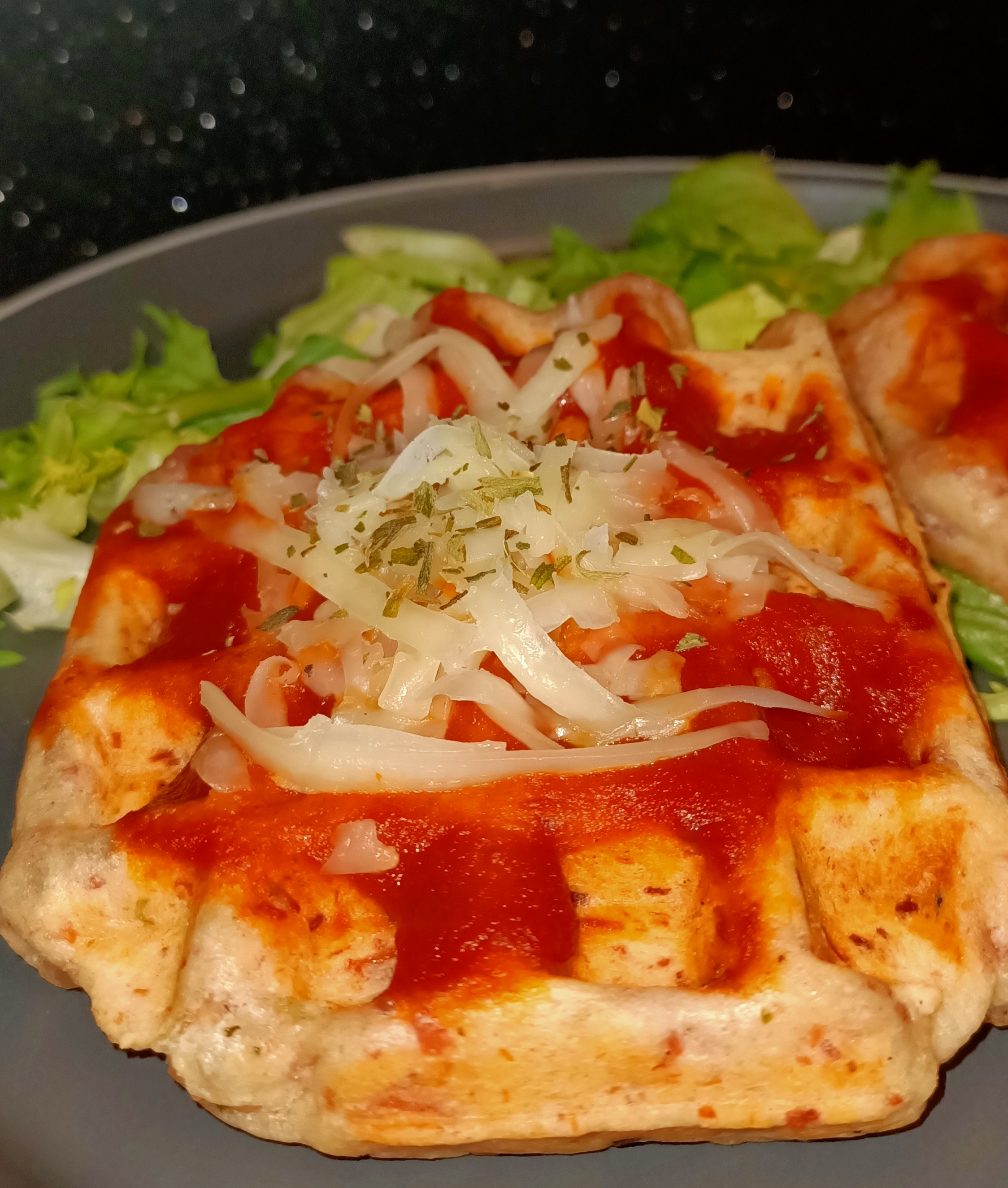 Pon las bolas de gofre bien repartidas en el gofrera hasta que estén hechas y luego pon encima la salsa de tomate y el queso.