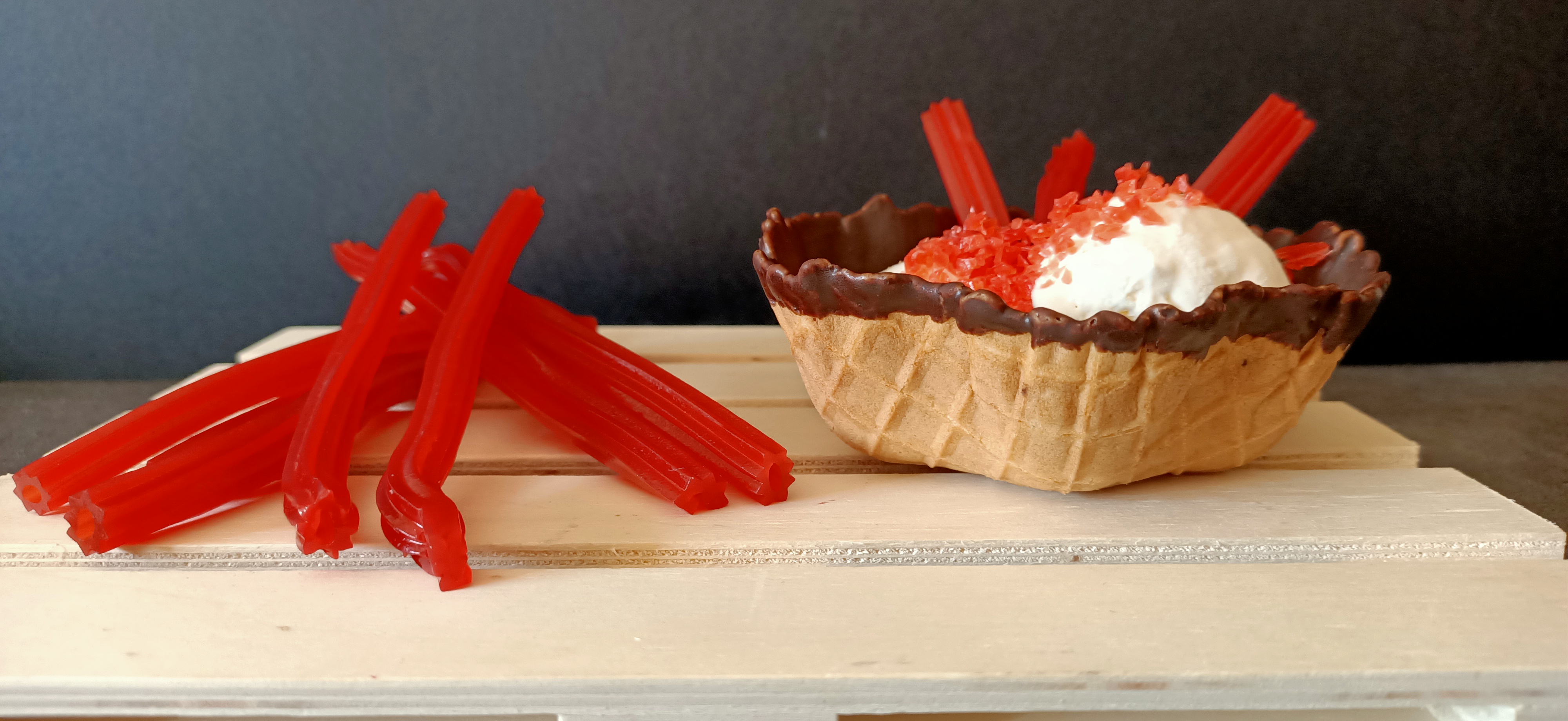 Helado cremoso de queso con trocitos de regaliz rojo