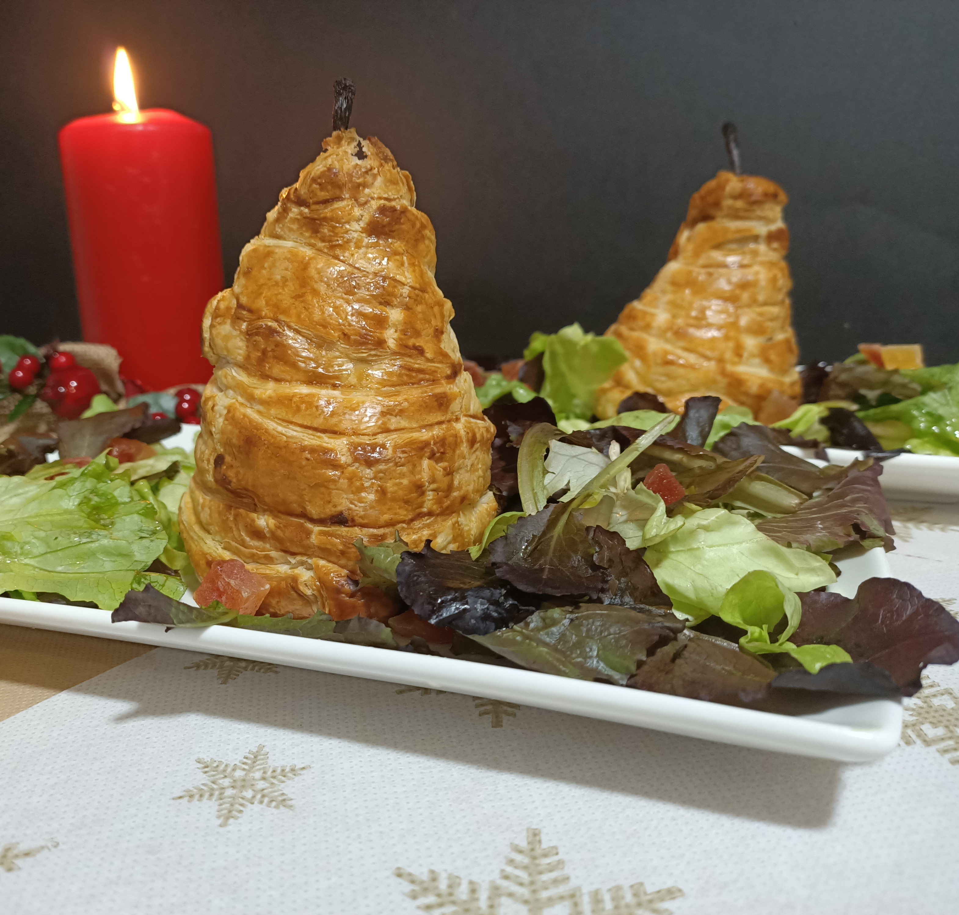 Pera en hojaldre y ensalada con roquefort y nueces.