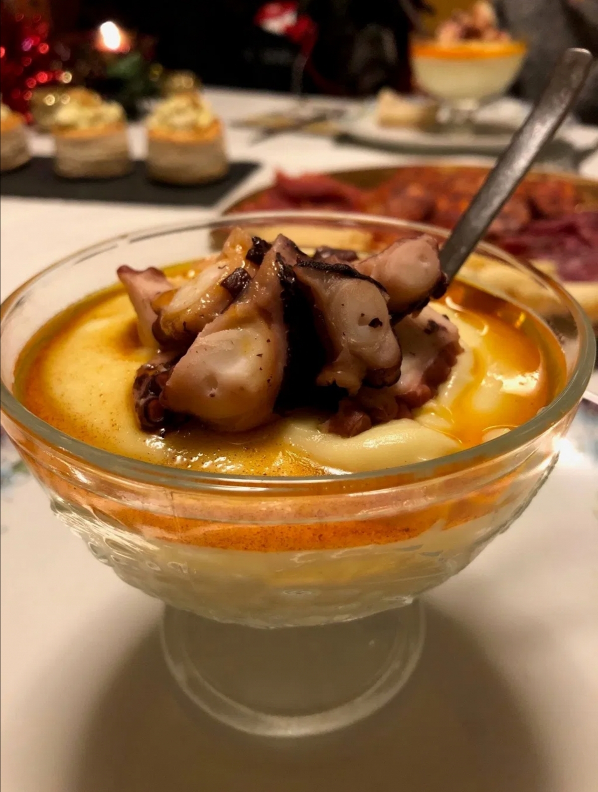 Reparta la emulsión de patata en vasos de chupito o similares e introduzca en cada uno 1 cucharilla pequeña. Ponga encima una rodaja de pulpo y riegue con el aceite de pimentón. Espolvoree con unas escamas de sal y sirva.