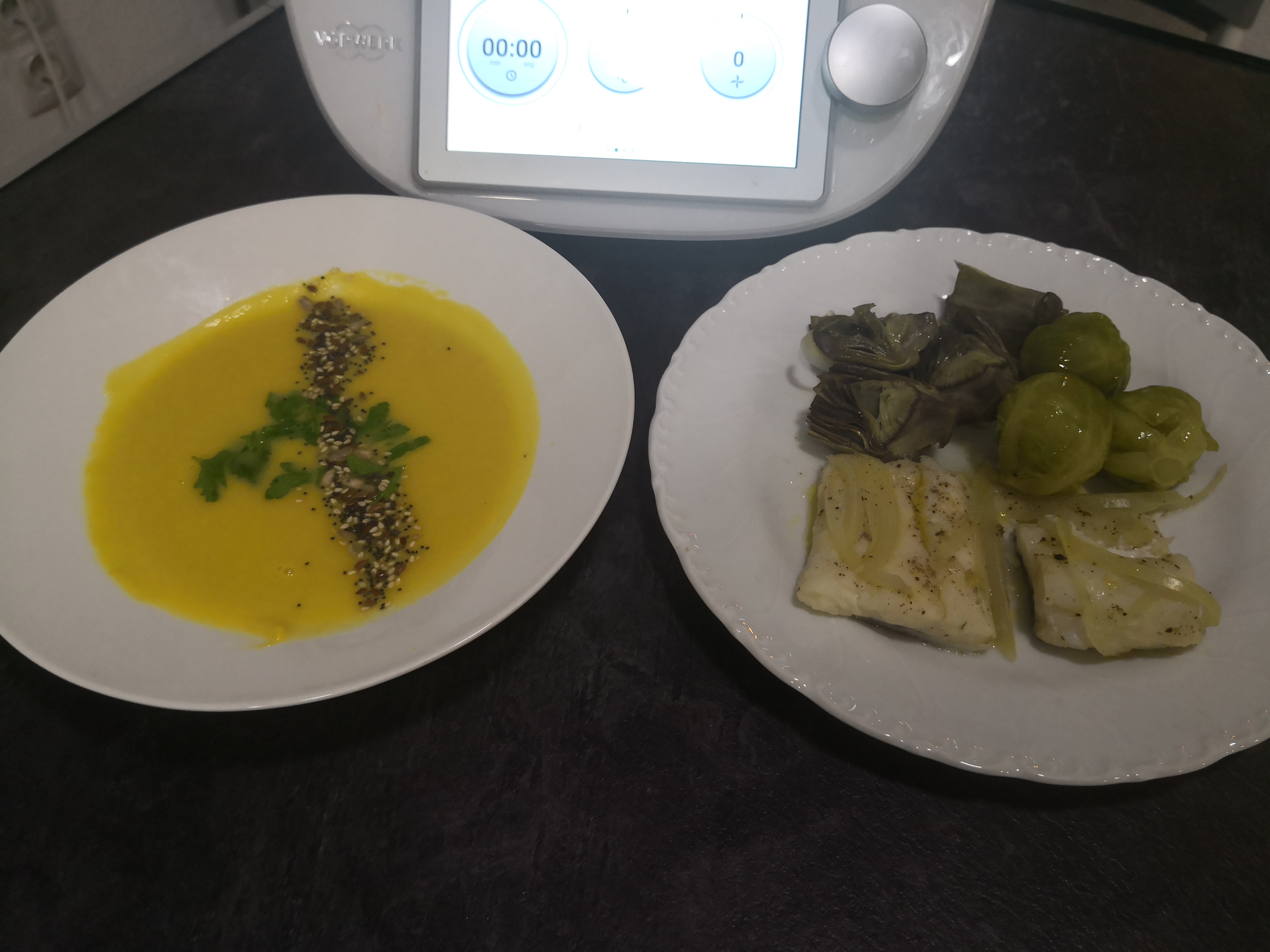 Servir la sopa de primero y el pescado acompañado de las verduras de segundo.