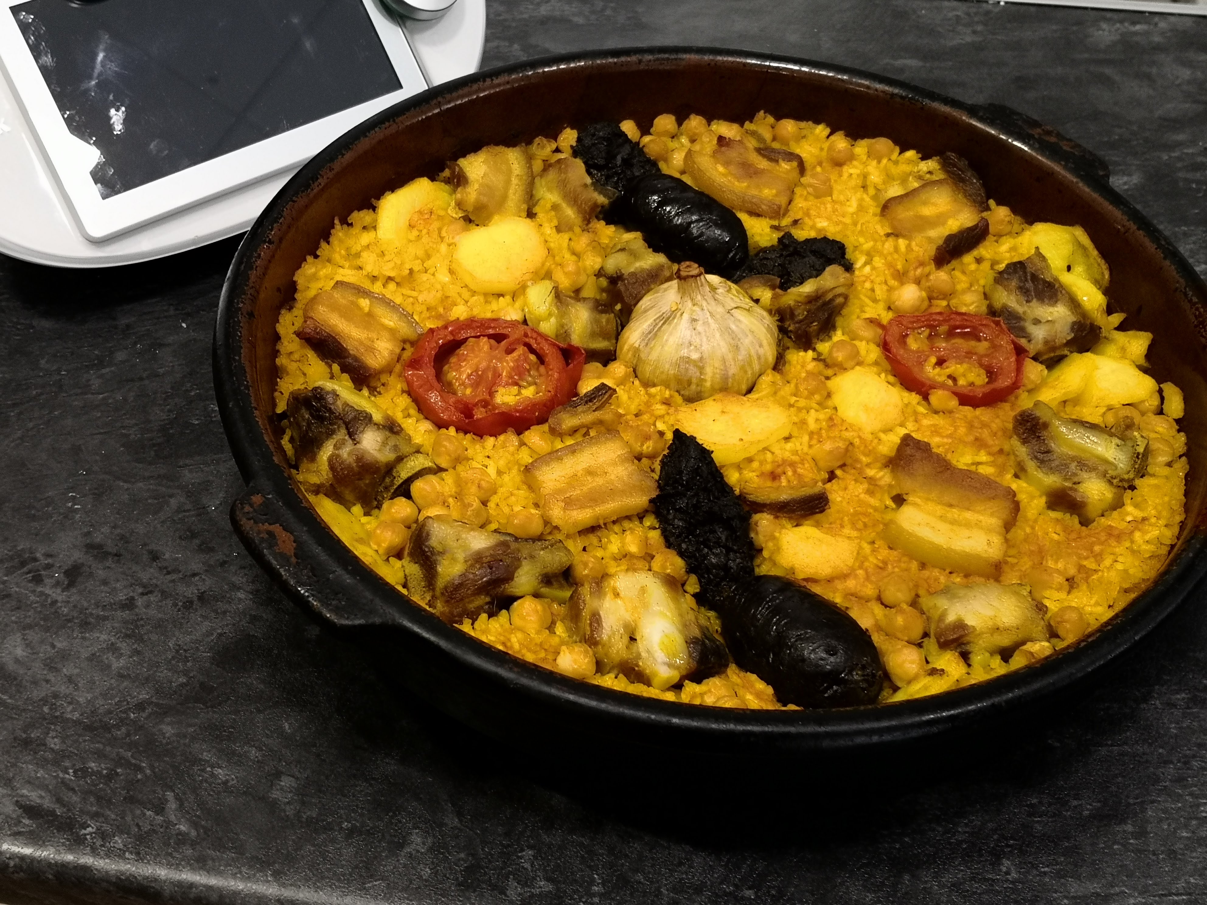9 _ Verter en la cazuela reservada, añadir los garbanzos, la patata, el tomate, las morcillas.