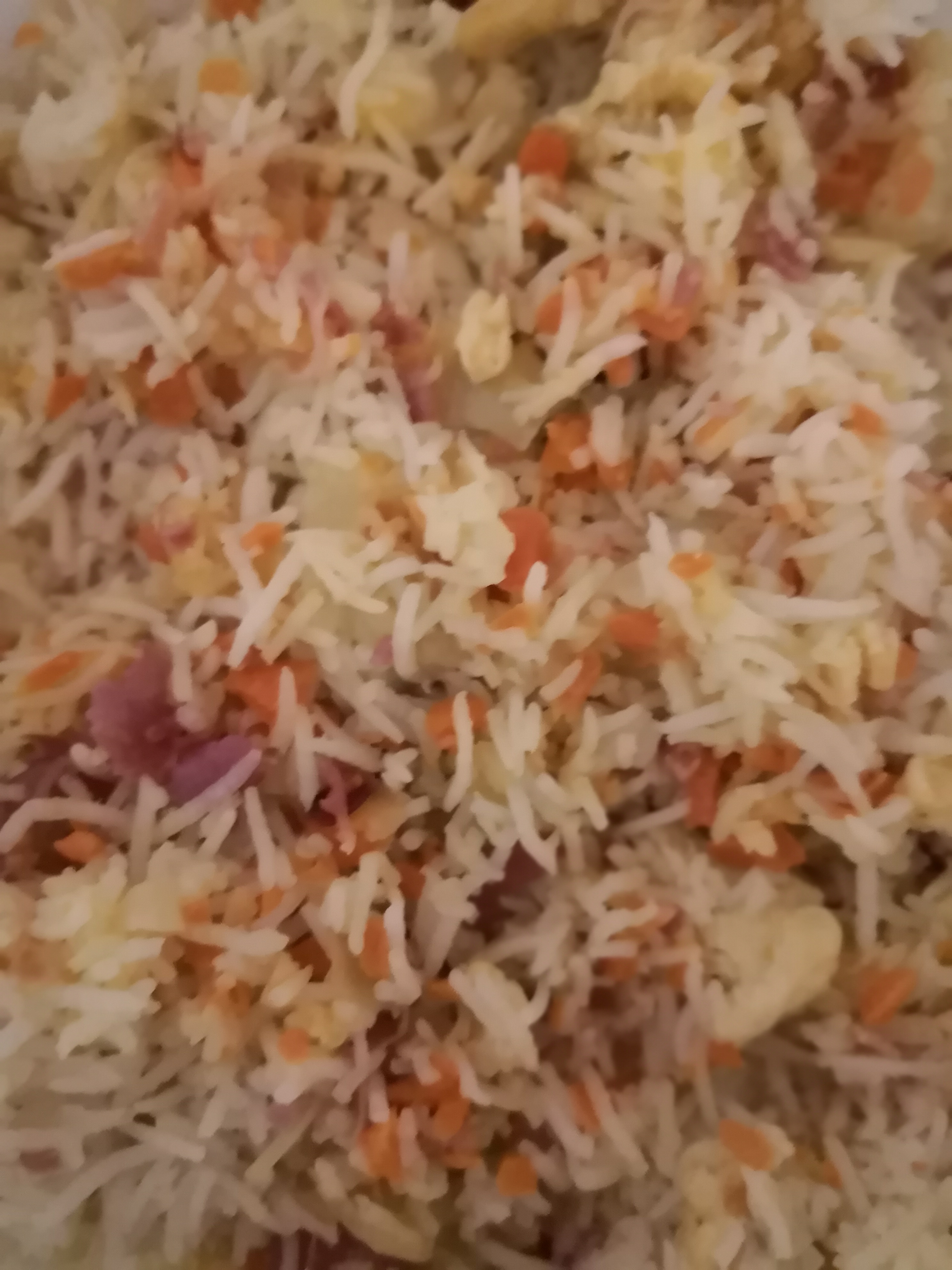 Terminado este tiempo, retiramos el arroz y lo volcamos en el bol grande junto con la cebolla, zanahorias y huevos. Añadimos el beicon reservamos y mezclamos todo con cuidado.