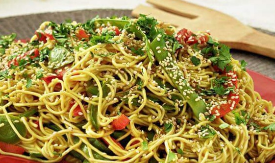 Deliciosos fideos chinos con verduras al curry.