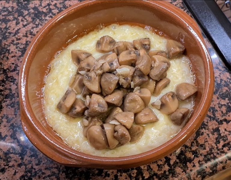 5. Retira el queso del horno, vierte encima los champiñones y sirve inmediatamente.