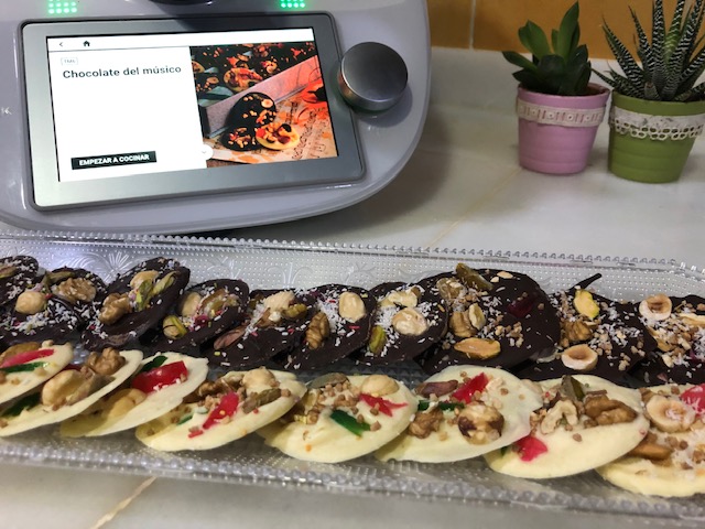 - Añade el chocolate restante y mezcla 2 min/vel 3. Vierte en un bol. Con una cucharita, rellena con el chocolate fundido el fondo de 6 moldes de silicona de aprox. Ø 5 cm (tiene que quedar una capa de 2-3 mm) y coloca sobre el chocolate, de forma decorativa, ¼ de: frutos secos y fruta escarchada . Reserva en el congelador durante unos minutos para que se endurezca el chocolate y luego desmolda con cuidado. Repite el procedimiento con el chocolate e ingredientes restantes. Sirve o conserve en el frigorífico en un recipiente hermético