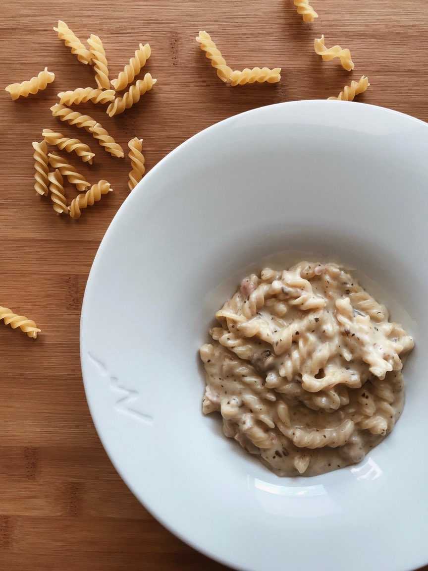 Hoy os presento una pasta sencilla y exquisita de macarrones carbonara con cerveza , yo como no me quedaban macarrones hice fusilli . Estaban buenisimos , por qué han quedado los platos limpios .