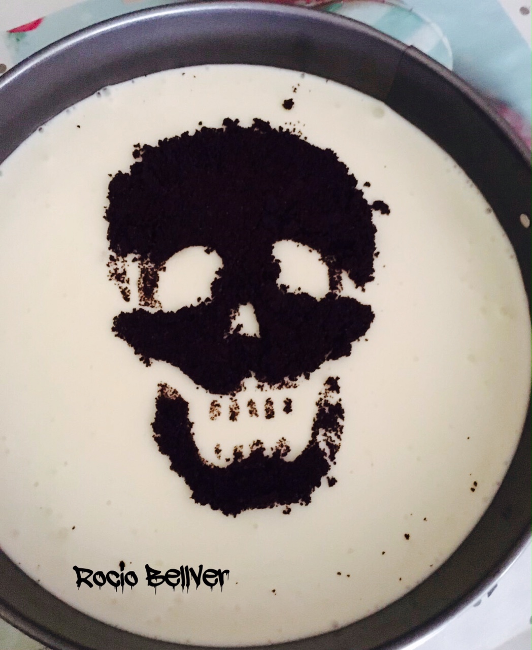 8 - Desmolde el cheesecakey coloque encima una plantilla precortada con motivos de Halloween y espolvoree las galletas reservadas , retire la plantilla y sirva .