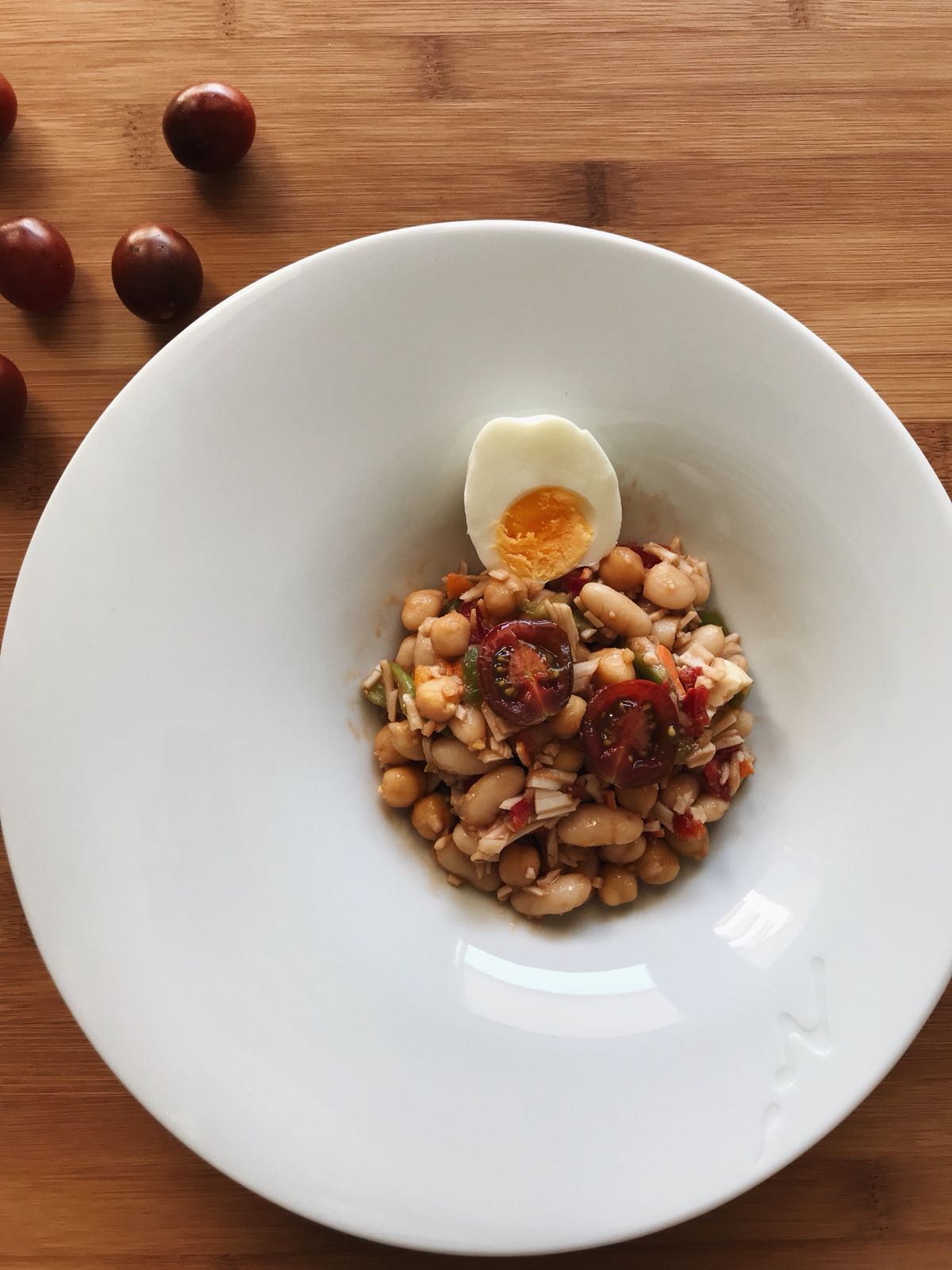 Mezclaremos en una ensaladera todas las legumbres cocidas ,añadiremos el tomate cortado en dados y los huevos duros troceados. A continuación pondremos en el vaso los palitos de surimi y troceamos 3 seg / vel 4 . Volcaremos en la ensaladera , mezclaremos y reservamos. Sin lavar el vaso vamos a preparar la vinagreta , pondremos todos los ingredientes el pimiento rojo y verde , la cebolleta , el aceite , el vinagre , la mostaza , el ketchup y la sal 4 seg / vel 4. Vertemos en la ensalada , mezclamos y a disfrutarla .
