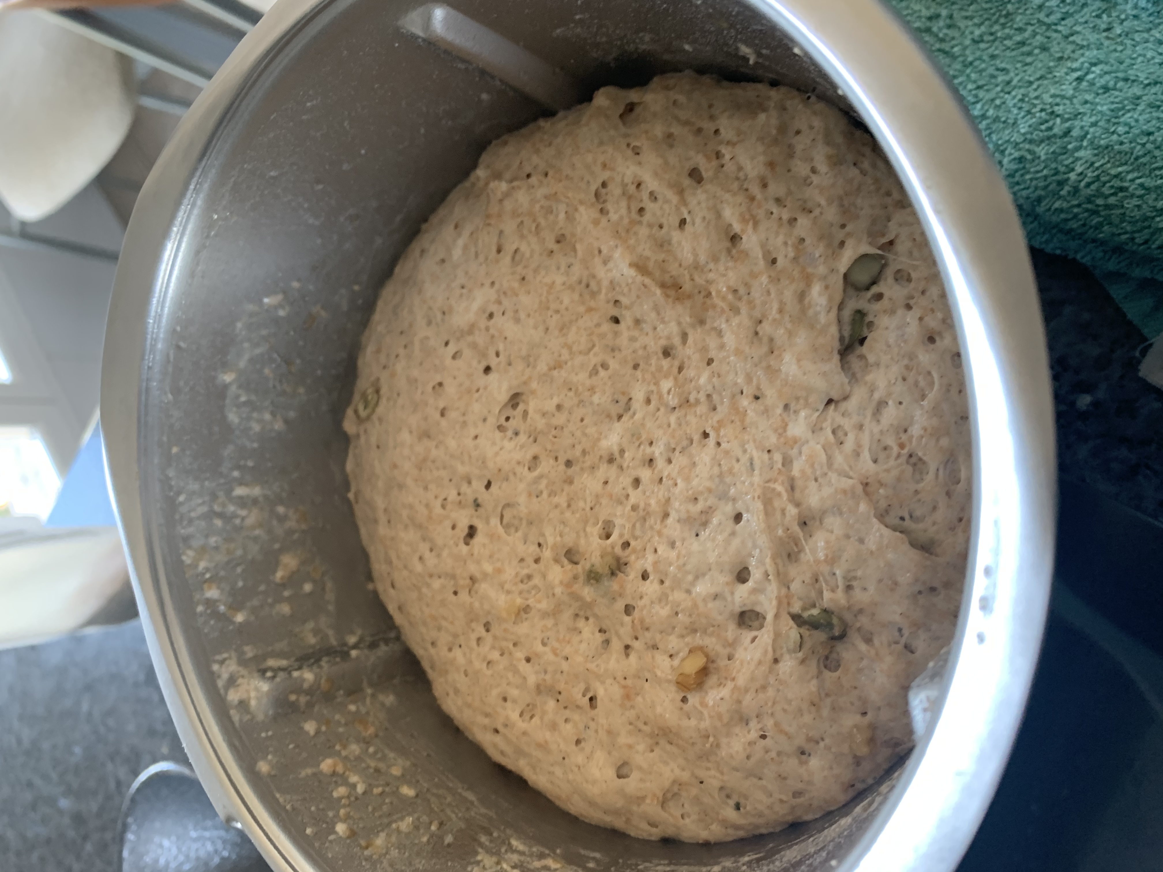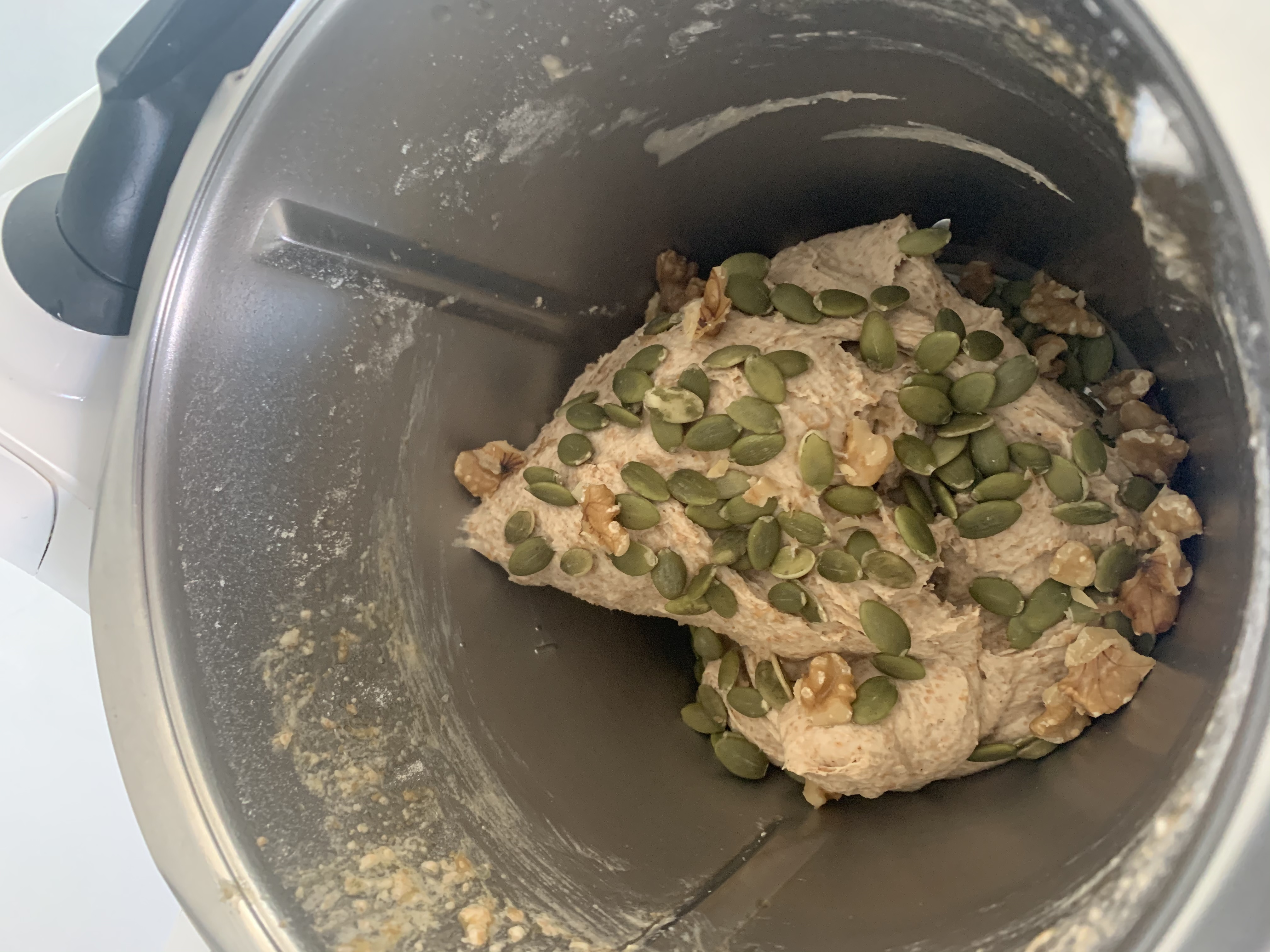 Añadir las nueces y las pipas y amasar 1 minuto velocidad espiga.