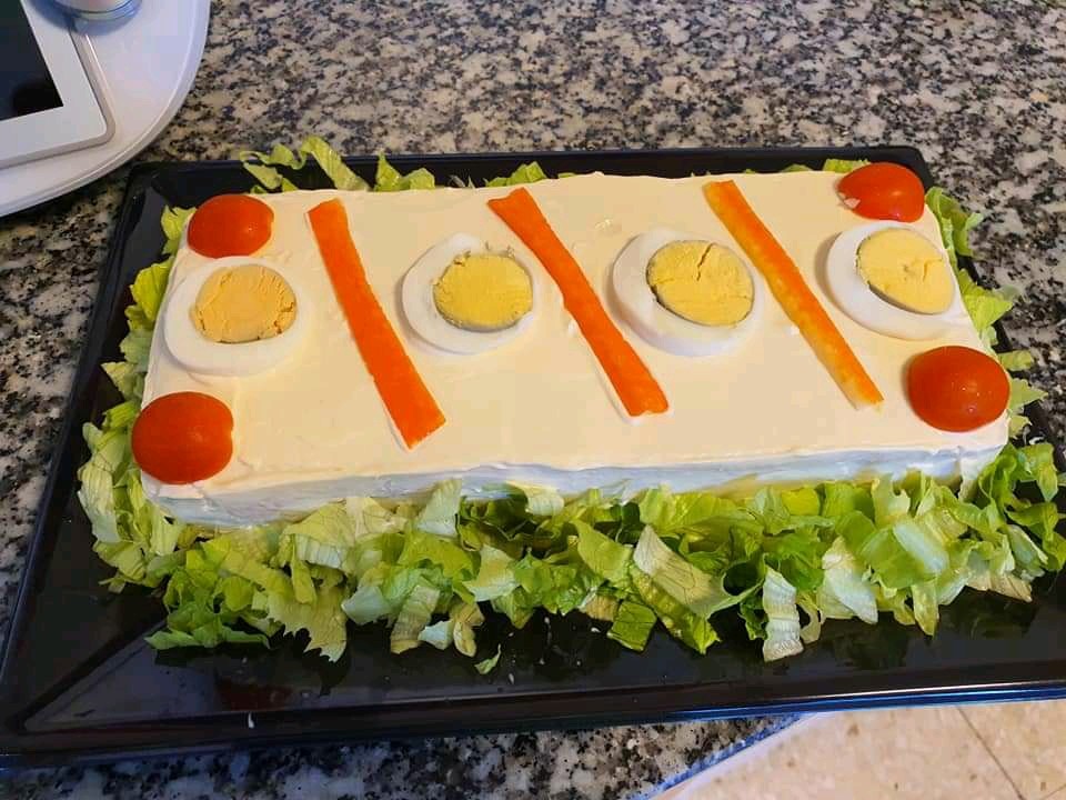 Cubra con film transparente un recipiente rectangular de aprox 20 x 15 cm. Vuelque sobre el fondo la mayonesa restante, ponga encima una capa de pan de molde y vierta la mitad del contenido del vaso. Coloque otra capa de pan, el resto del relleno y, por último, otra capa de pan. Tape el recipiente y reserve en el frigorífico como mínimo 8 horas (mejor de un día para otro).