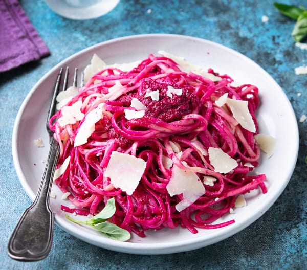 Por la abertura de la tapa, añada la sal y los tallarines y, sin poner el cubilete, cocine el tiempo que indique el paquete/100°C//vel 1. Escurra los tallarines en el recipiente Varoma. Sirva con el pesto de remolacha y espolvoree con el parmesano en lascas.
