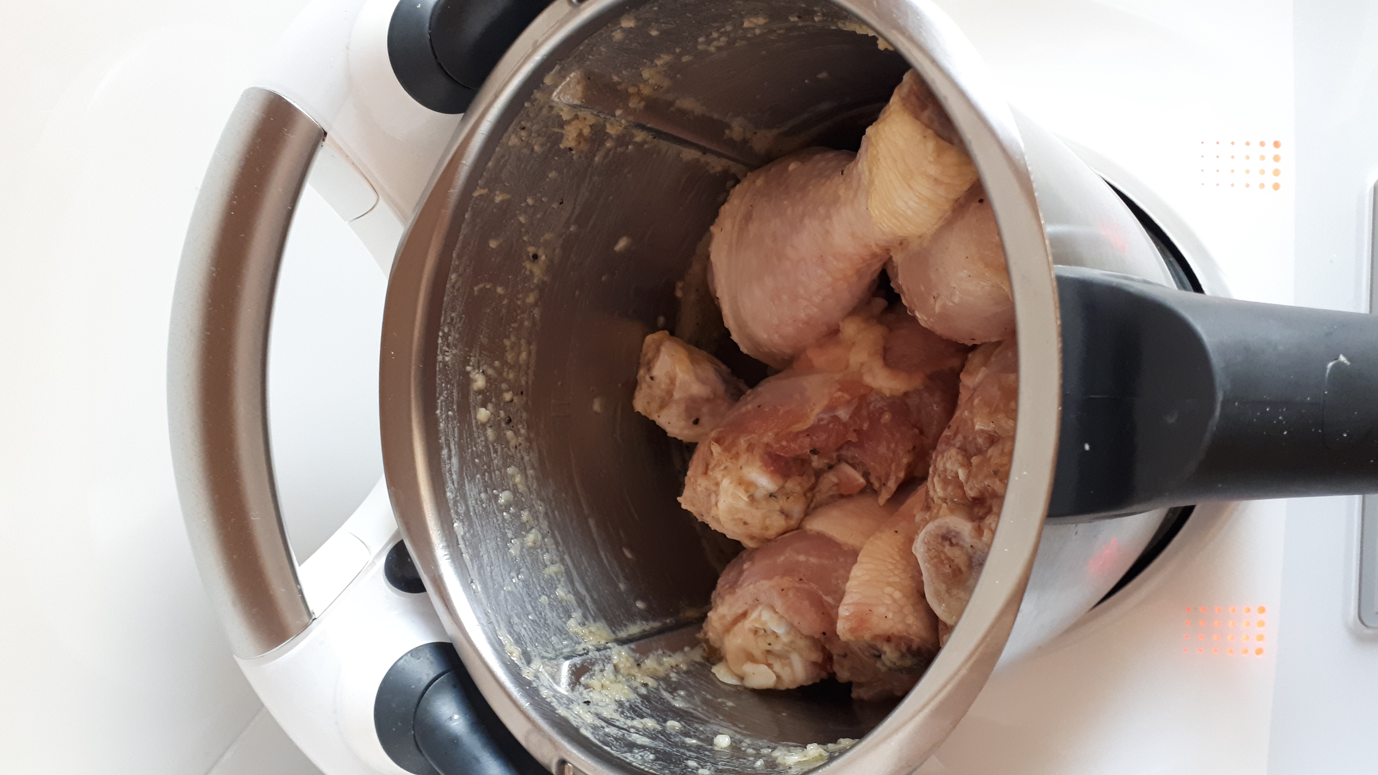 La siguiente pregunta es la cantidad, eso sí, sabéis que no podéis superar el máximo de 2,200 l de capacidad que tiene el vaso, así procurando no obstruir el bocal, pero si necesitamos más cantidad, tenéis un recipiente y bandeja varoma con la que podéis doblar ingredientes, ¿ lo sabías?... Podéis poner más muslos en el recipiente e incluso, un consejito mio es aprovechar la bandeja varoma para la guarnición, así vuestros platos estarán más completos. En este caso yo he cocinado de guarnición Vasitos de arroz al vapor , pero muchas veces pongo patatas chasqueadas y huevos duros.