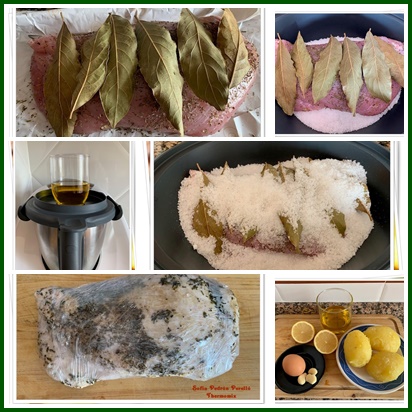 - Cubra la pechuga de pavo con el laurel y las hierbas frescas y átela con hilo de cocina. Rellene el fondo del recipiente Varoma con la mitad de la sal gorda, coloque la pechuga encima y cúbrala bien con el resto de la sal. Tape y reserve.