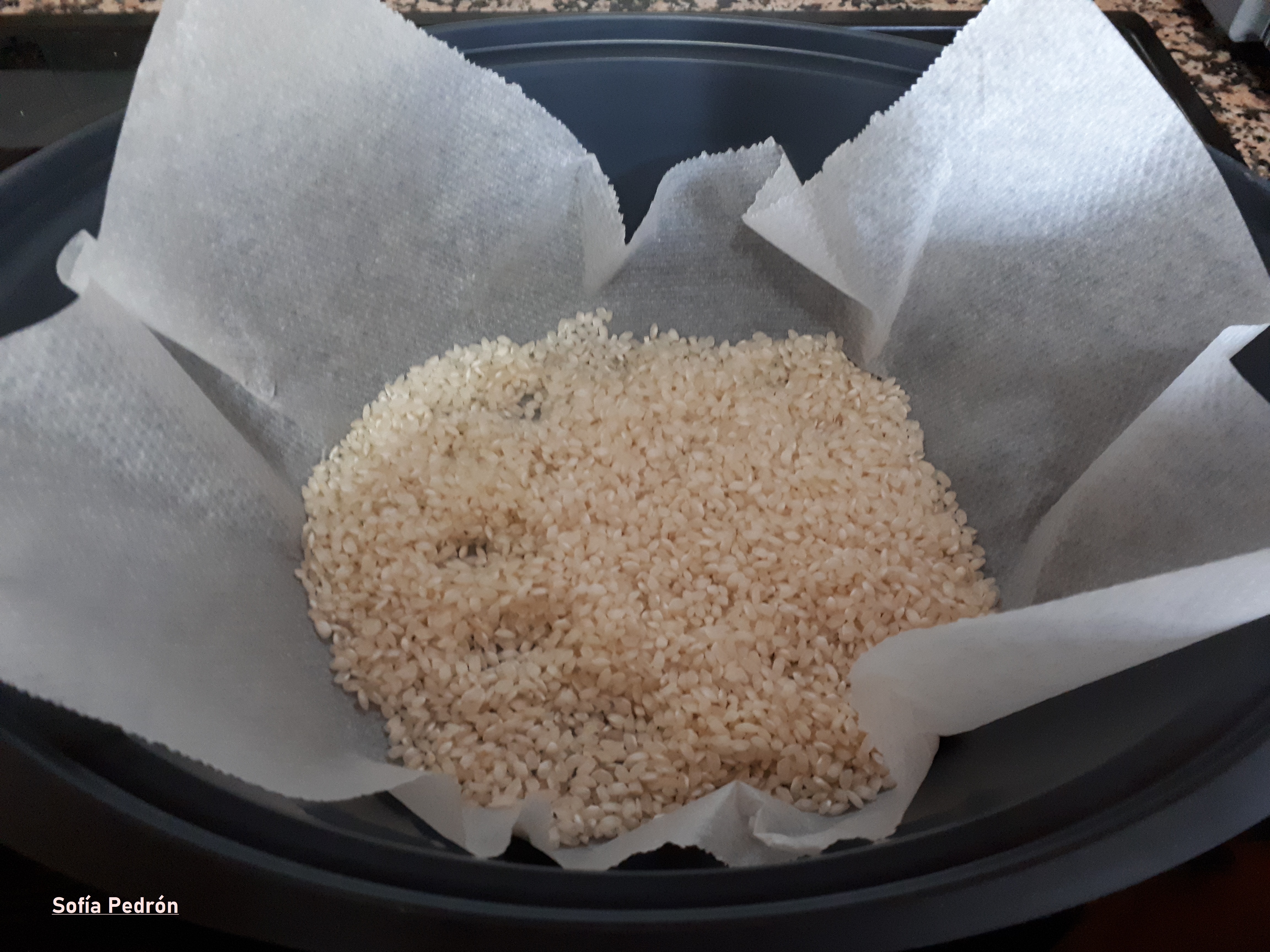 Por otra parte podemos cocinar el arroz directamente en el recipiente varoma, colocando un papel vegetal en el fondo del recipiente. Las cantidades y tiempos serían los mismos que con los vasitos.