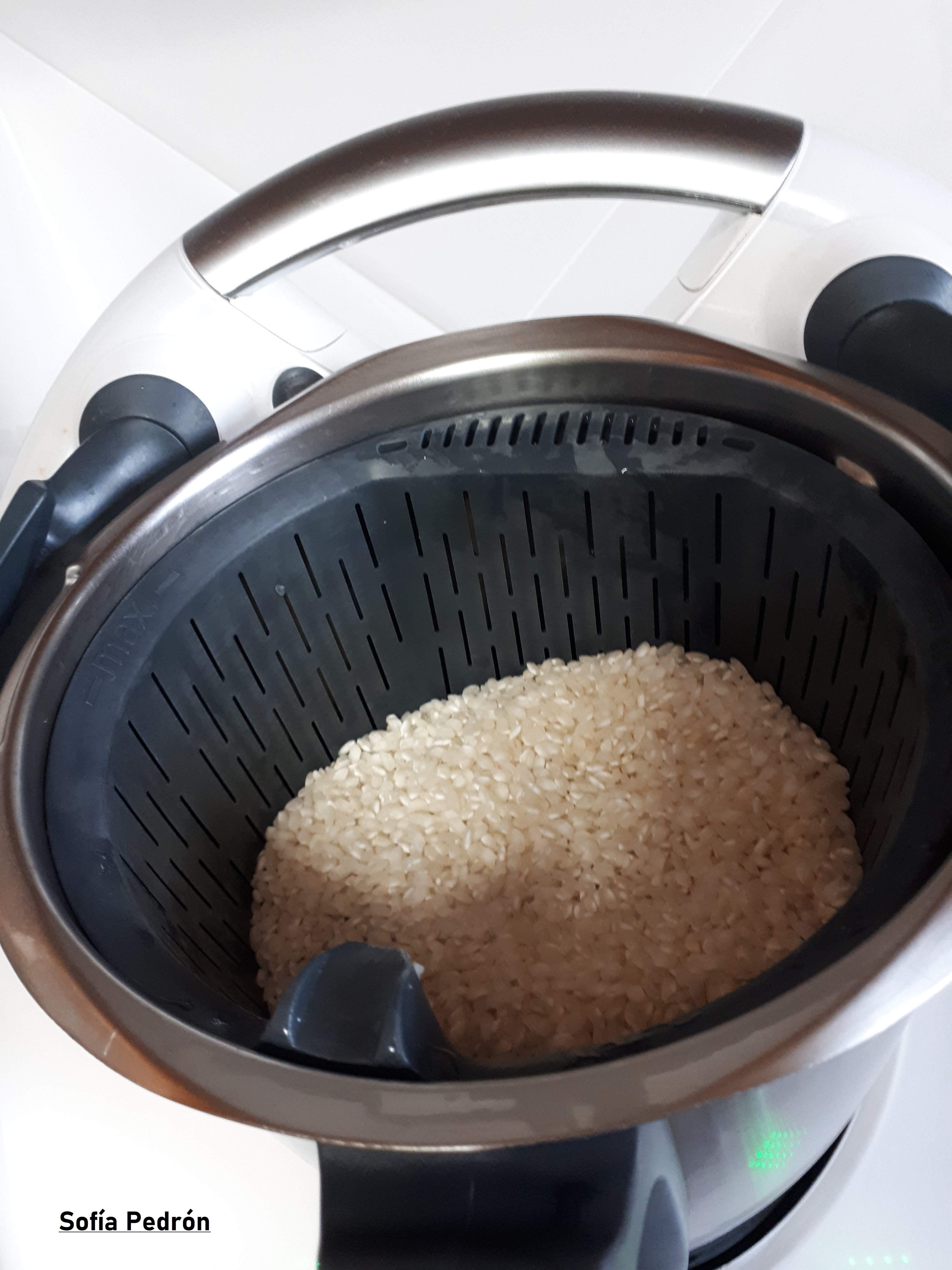Acabado el tiempo , colocaremos el cestillo en el vaso , vertimos el arroz dentro y programamos 15 minutos / 100º/ velocidad 4.