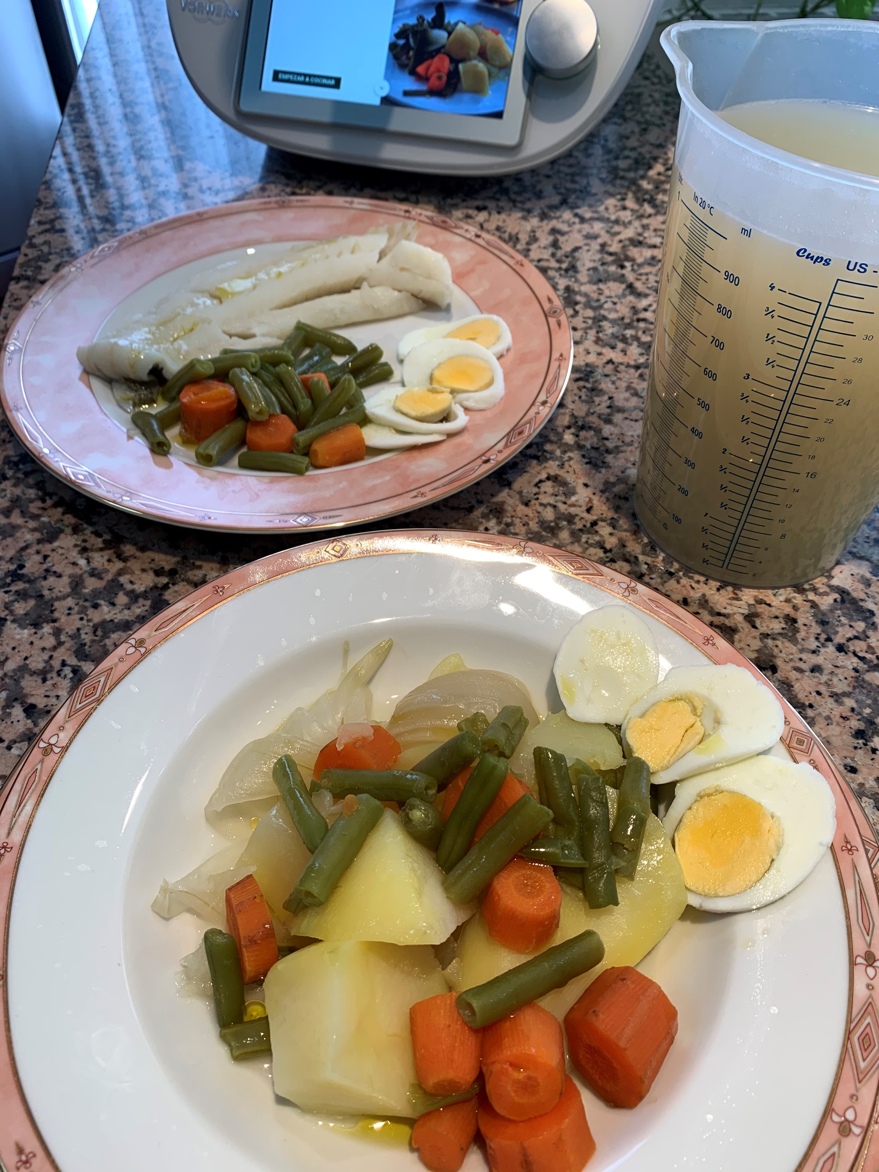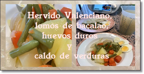 En este menú he querido aprovechar y al mismo tiempo que cocinamos el hervido he puesto dos lomos de bacalao y unos huevos duros que acompañaran al hervido. El caldo sobrante lo aprovecharemos para guardar y cocinar en otra ocasión en cualquier guiso que nos apetezca, ya que le aportara un fantástico sabor de las verduras y no habrá necesidad de utilizar pastillas de caldo de verduras. Otra sugerencia es el balcalao, a nosotros nos gusta muchísimo utilizarlo en una rica tortilla que podéis hacer también al vapor en vuestro thermomix. Esto os lo contaré en otra ocasión.