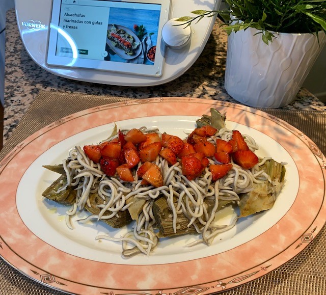ALCACHOFAS MARINADAS CON GULAS Y FRESAS