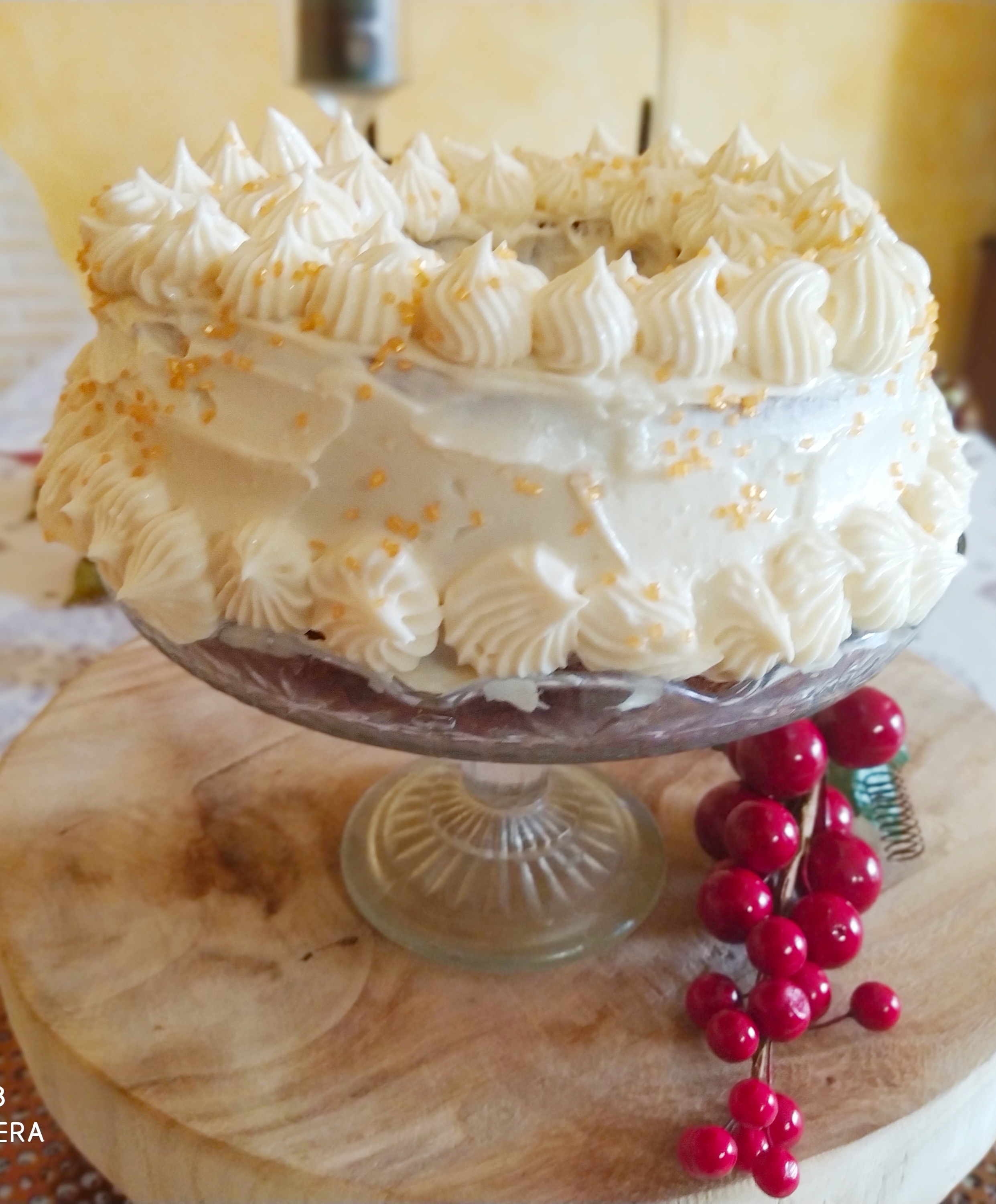 10. Corte el bizcocho por la mitad y rellene con la mitad del Frosting. Cubra con la otra parte del bizcocho y extienda el resto del frosting sobre la superficie. Espolvoreé con las nueces y deje enfriar 15 minutos en el frigorífico antes de servir