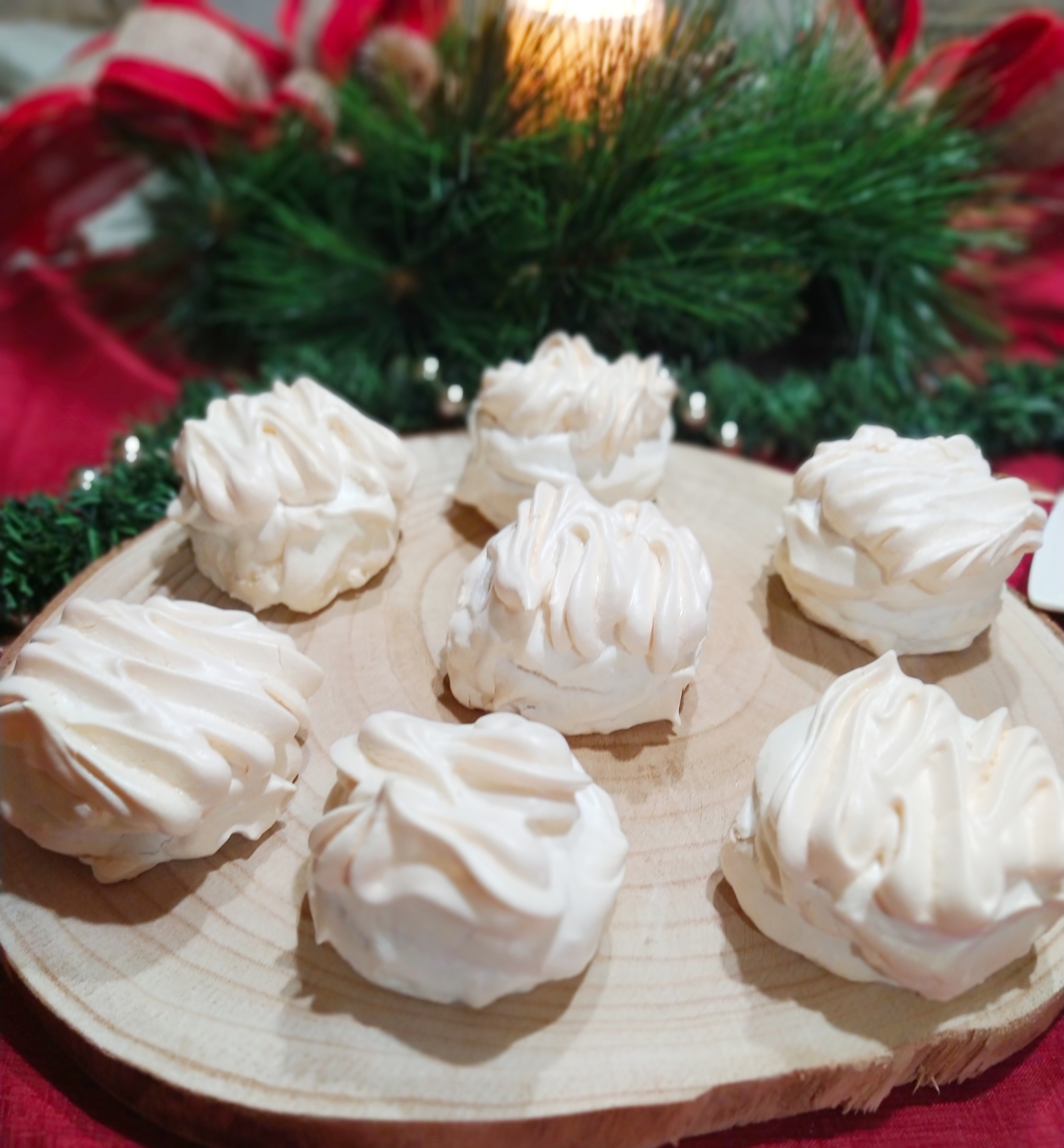 cortar el bizcocho plancha con un corta pastas de 6 cm pon sobre el disco una cantidad generosa de dulce de boniato tapar con otro disco y cubrir con el merengue tiene que secarse no dorarse en exceso