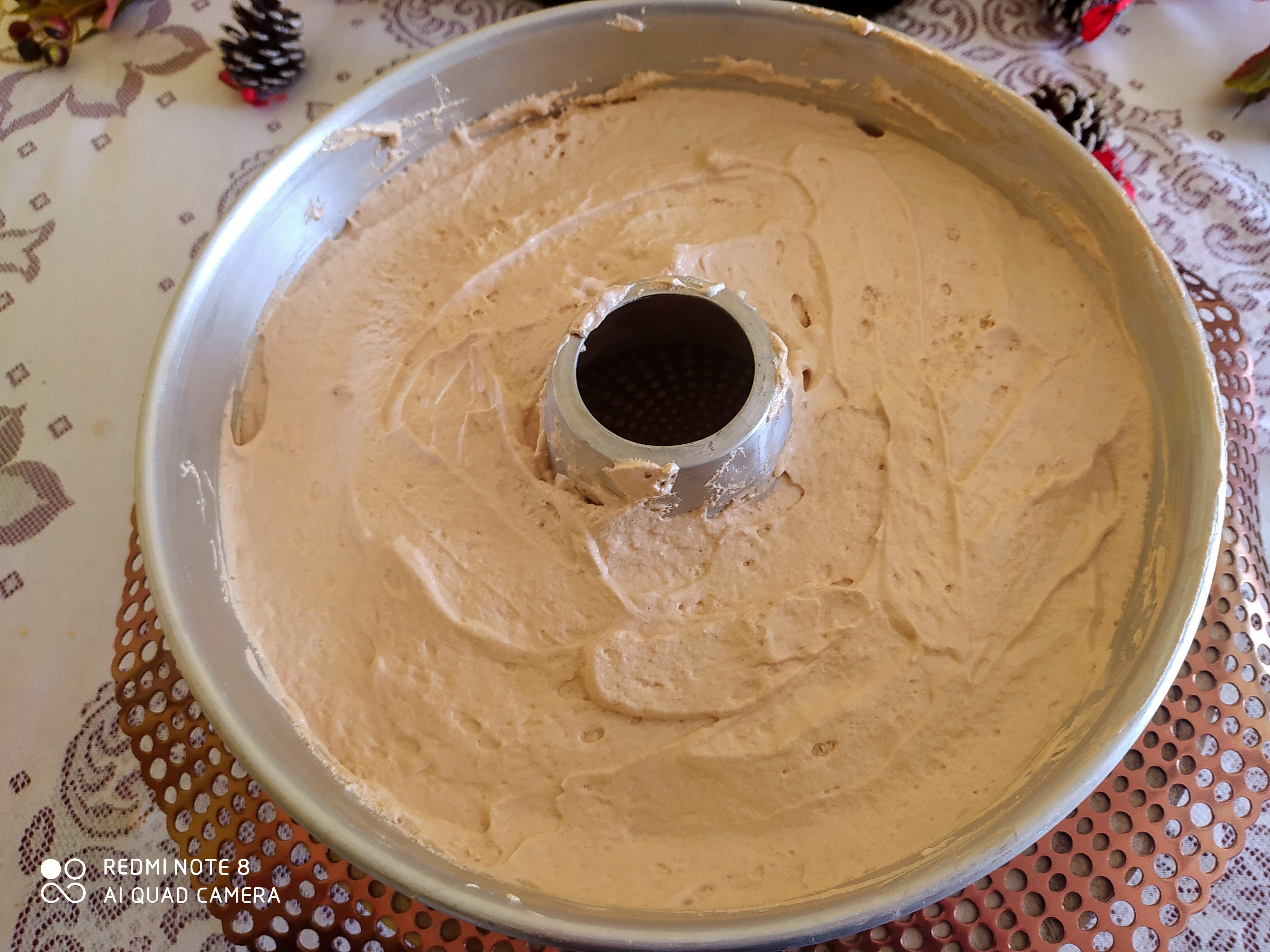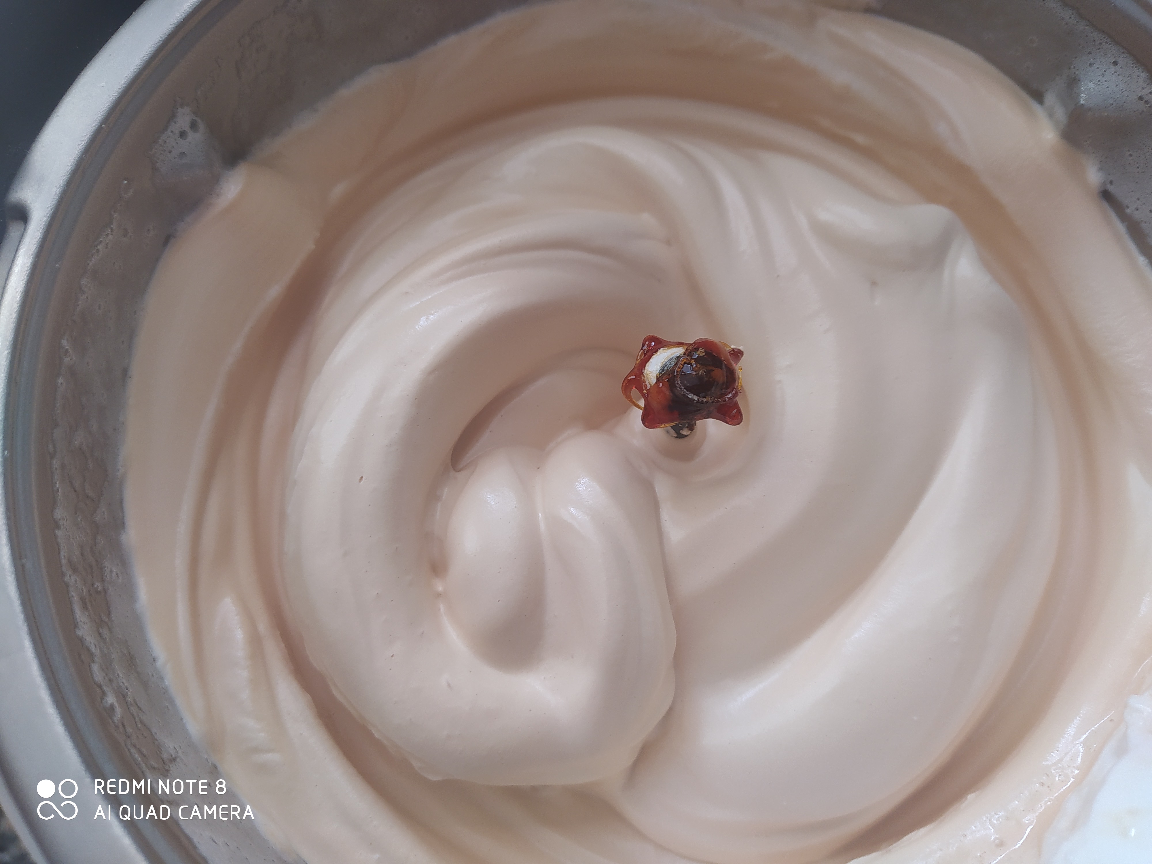 - Pon la mariposa en las cuchillas añade las claras y una puntita de cremor tártaro 7 min/ vel 3.5 . Añade el caramelo oscuro poco a poco por el lateral de la tapa 10 min/vel 3 . Pon en un rollo de 26 cm ,engrase con antelación el molde con mantequilla o manteca de cerdo